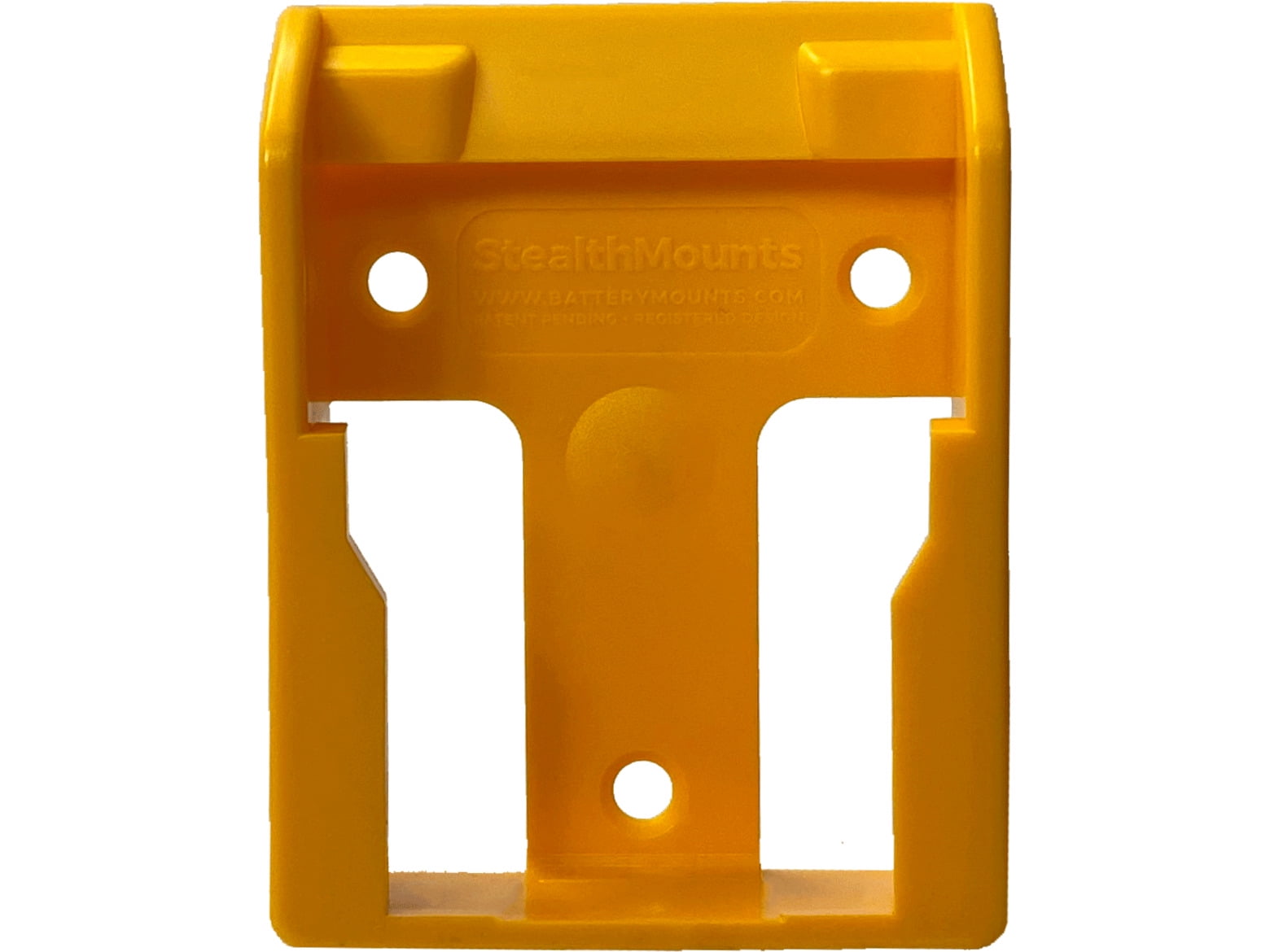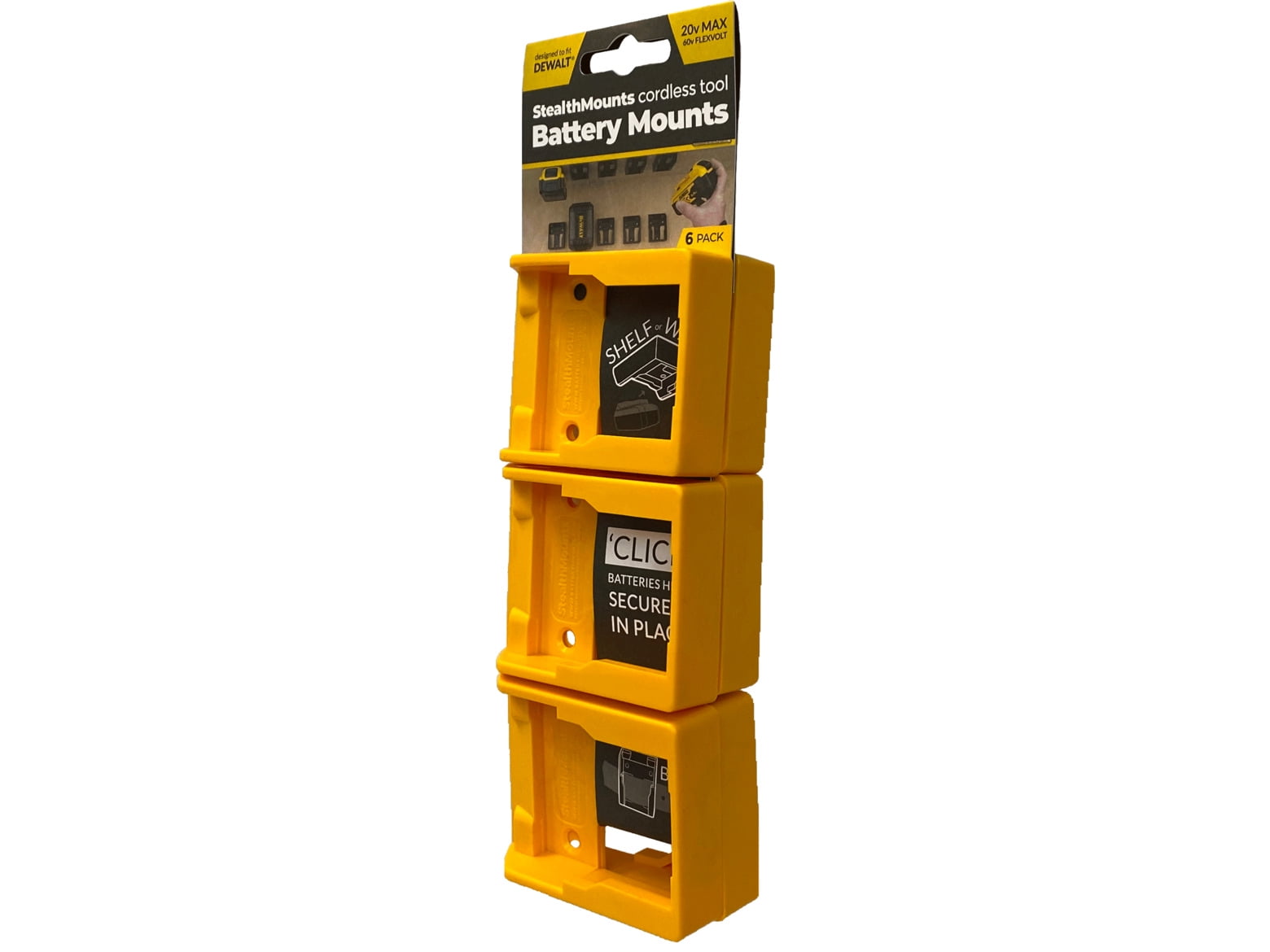 StealthMounts YELLOW Battery Mounts for DeWalt XR 20v and 60v cordless batteries, including flex volt. Keep your batteries organized and right where you need them. Made from strong injection moulded ABS plastic with holes for mounting. Batteries ‘click’ into place and can be held at any angle. Can be mounted at varying distance from one another and in very small spaces for maximum workshop efficiency.