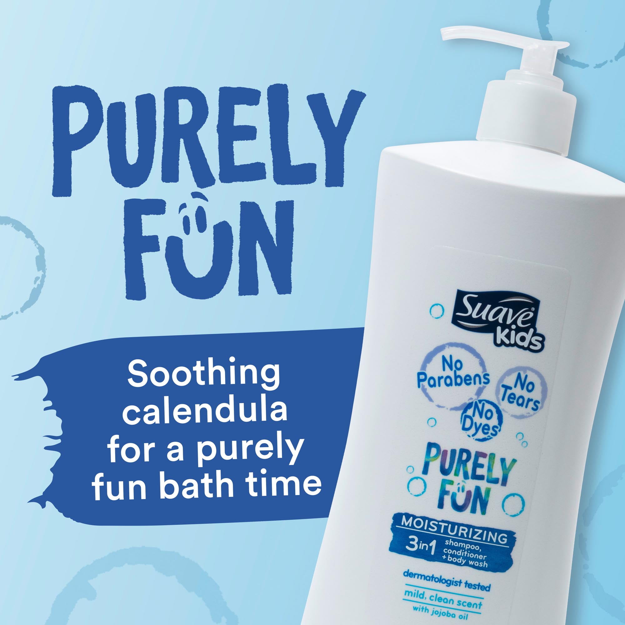 Suave Kids Moisturizing Purely Fun 3 in 1 Shampoo + Conditioner + Body Wash uses a mild, tear-free formula made just for kids that contains no Parabens, no Dyes, and aluminum-free. Infused with Jojoba oil, known for its moisturizing benefits, this 3in1 gently blends shampoo, conditioner, and body wash in one easy step. This product features a mild, clean scent that will leave your little ones smelling fresh from head to toe. Hypoallergenic and dermatologist-tested, Suave Kids Purely Fun 3-in-1 Shampoo, Conditioner, and Body Wash is designed to be safe for kids of all ages. The gentle formula contains no Parabens or Dyes. This three-in-one shampoo, conditioner, and body wash makes it simple and quick to bathe your child. With soothing calendula and a tear-free formula, Suave Kids Purely Fun 3-in-1 helps make bath time a relaxing time for everyone. How to Use: Wet hair and skin. Work into a creamy lather on hair, scalp, and body. Rinse well. For over 70 years, Suave has designed and produced quality beauty solutions for people across the world. Suave Kids has a full line of shampoos, conditioners, and body washes that are hypoallergenic, tear-free, and ophthalmologist-tested. This pack is recyclable. Rinse. Recycle. Reimagine.