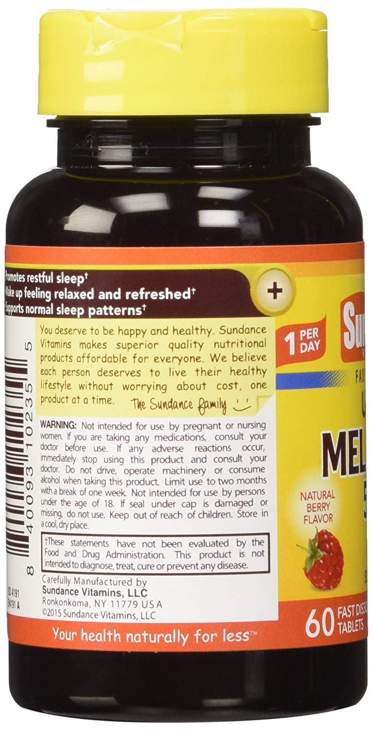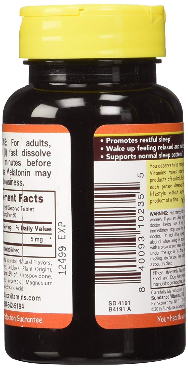 Promotes restful sleep.* Wake up feeling relaxed and refreshed.* Supports normal sleep patterns.* , Gluten free. *These statements have not been evaluated by the Food and Drug Administration. This product is not intended to diagnose, treat, cure or prevent any disease.Promotes restful sleep.* Wake up feeling relaxed and refreshed.* Supports normal sleep patterns.* You deserve to be happy and healthy. Sundance Vitamins makes superior quality nutritional products affordable for everyone. We believe each person deserves to live their healthy lifestyle without worry about cost, one product at a time. Sleep aid.* Gluten free. *These statements have not been evaluated by the Food and Drug Administration. This product is not intended to diagnose, treat, cure or prevent any disease.Ingredients: 1 Tablet: Melatonin 5 mg; Mannitol; Natural Flavors; Beet Root Powder; Cellulose (Plant Origin); Dextrose. Contains <2% of: Crospovidone; Silica; Sucralose; Vegetable Magnesium Stearate; Vegetable Stearic Acid