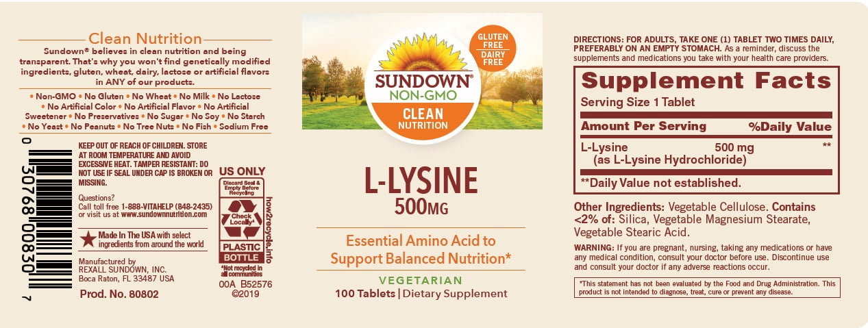 - Sundown L-Lysine 500 mg Essential Amino Acids, 100 Tablets:
