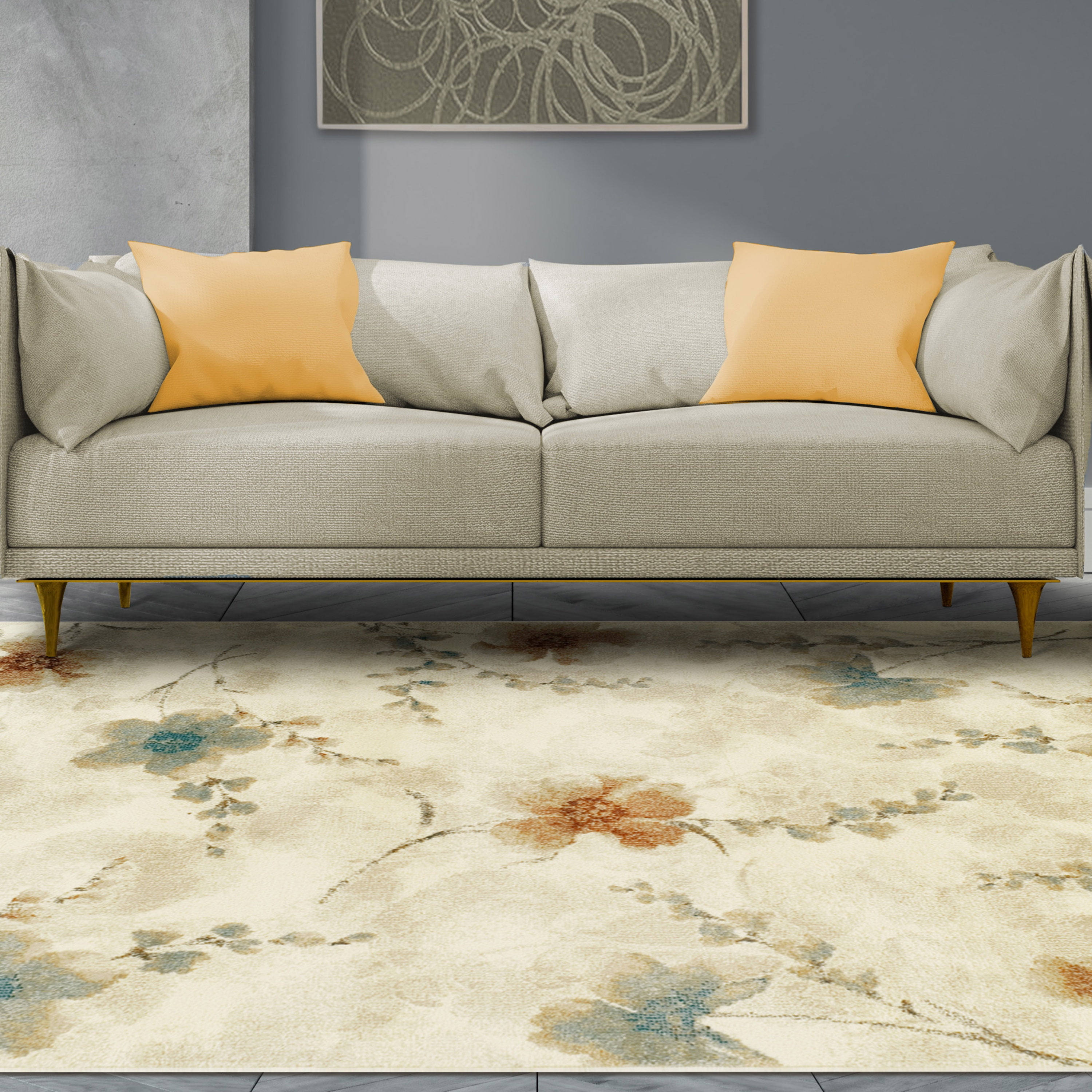 Bring the beauty of the garden to your floors with the Moffatt Area Rug. Made with 100% Polypropylene fibers and a 0.39" pile height, this rug can stand up to the most frequented rooms while remaining soft and long-lasting. This enchanting rug features flowers in shades of blue and orange to create subdued elegance in your favorite space. The subtle blossoms and leafy vines complement your choice of a stone or navy blue backdrop, perfect for any modern or shabby-chic aesthetic.