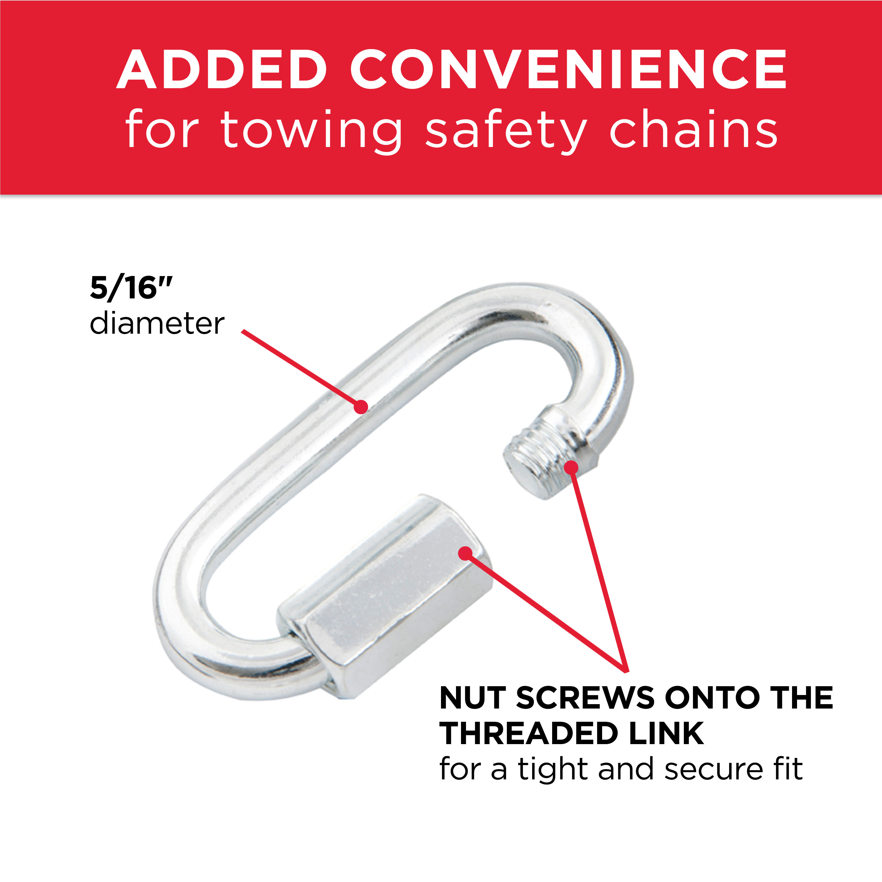 The TowSmart Quick Links are designed to be used with towing safety chains for a fast and easy connection between multiple lengths of chains. Quick Links eliminate the hassle of cutting or welding your existing chains. They can be used for added security for tie downs or towing chains. Ensure the nut is screwed on to the threaded side to prevent disconnection. It provides a tight and secure fit, and is made of corrosion-resistant materials designed to withstand harsh weather conditions.