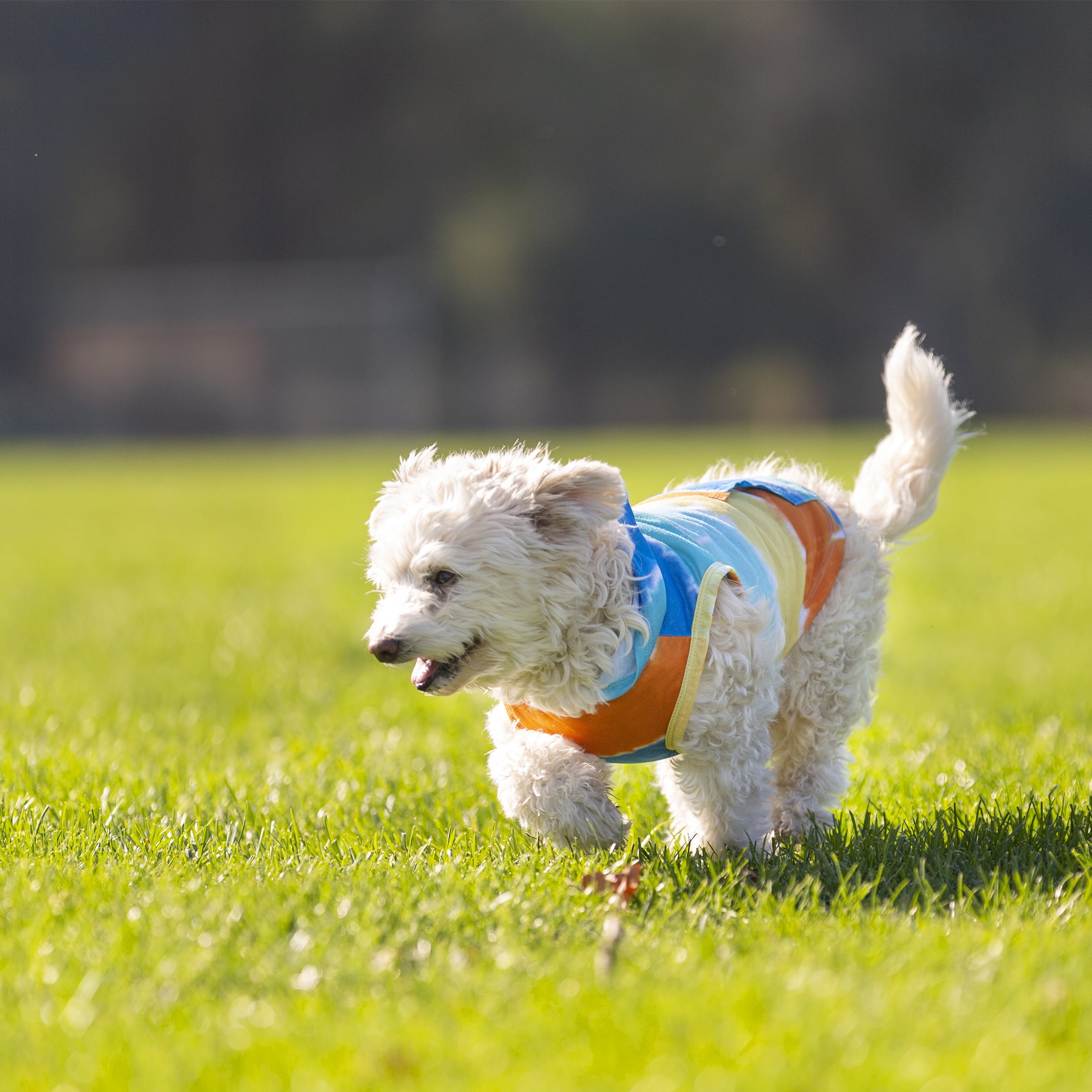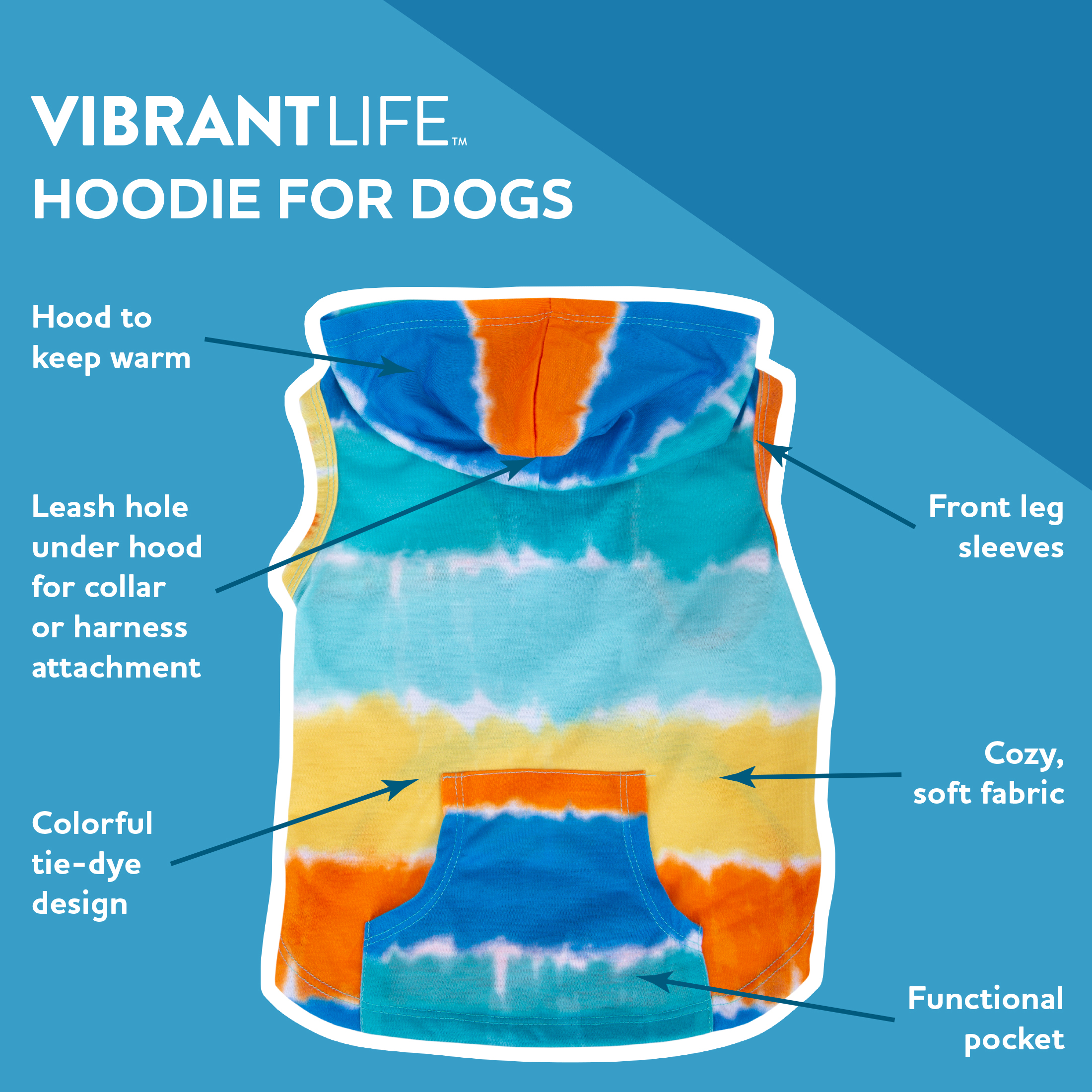 Vibrant Life Tie Dye print hoodie size Medium is perfect for your little dog. This hoodie has a fun tie dye print with fun multi color stripes of blues, yellow, and orange. Wear this hoodie while taking your walk in the park, or if you are just laying around the house with the family. This hoodie has a leash hole for easy leash attachment with your collar or harness. Help your pets live the Vibrant Life! Our products are specially crafted with one goal in mind, seeing your pet at its very best. With a variety of offerings designed to keep animals healthy, happy, and energized. Vibrant Life stands out as the brand that truly puts your pet first.TIE DYE PRINT HOODIE: Size Medium. From Vibrant Life. Lightweight fun multi-color tie dye print hoodie FOR MOST DOGS 20 TO 50 POUNDS: This one’s for the small pups weighing 20-50 pounds. Best fits pet sizes similar to Beagle, Standard Poodle BACK MEASURES 17 INCHES: Breed sizes do vary, so measure your pet before purchasing. Back length up to 17 inches PULLOVER STYLE: Just like a human hoodie, this pulls over the head, paws through the armholes. No other closures. REINFORCED LEASH OPENING ON NECK: For use with a collar or harness, worn underneath. SPOT CLEAN ONLY: Spot clean only, do not bleach. Lay flat to dry