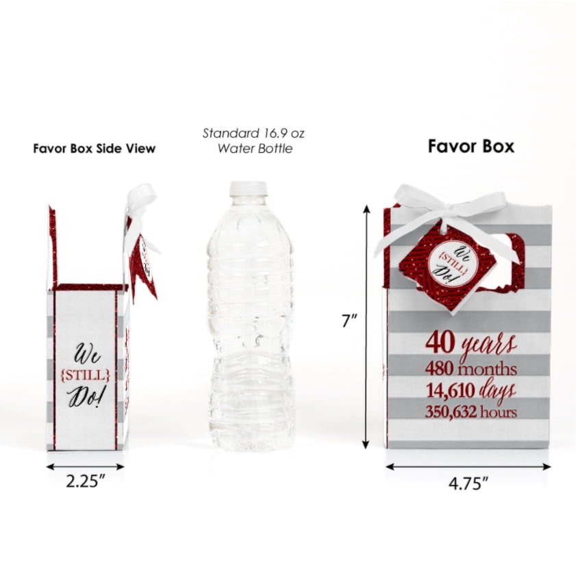 Include the display of sweet treats into your party decor by using our themed party favor boxes! These wedding anniversary favor boxes are sold in sets of 12, are the perfect size for your favorite candy, prize or treat! Display several in a grouping on a candy buffet table allowing guests to sample several treats, or send each person home with their own individual treat box! Custom printed with our original artwork, these boxes are created with a heavy duty satin paper that gives the finished product a photo like shine! The perfect complement to any celebration, you’ll love our themed party favor boxes!