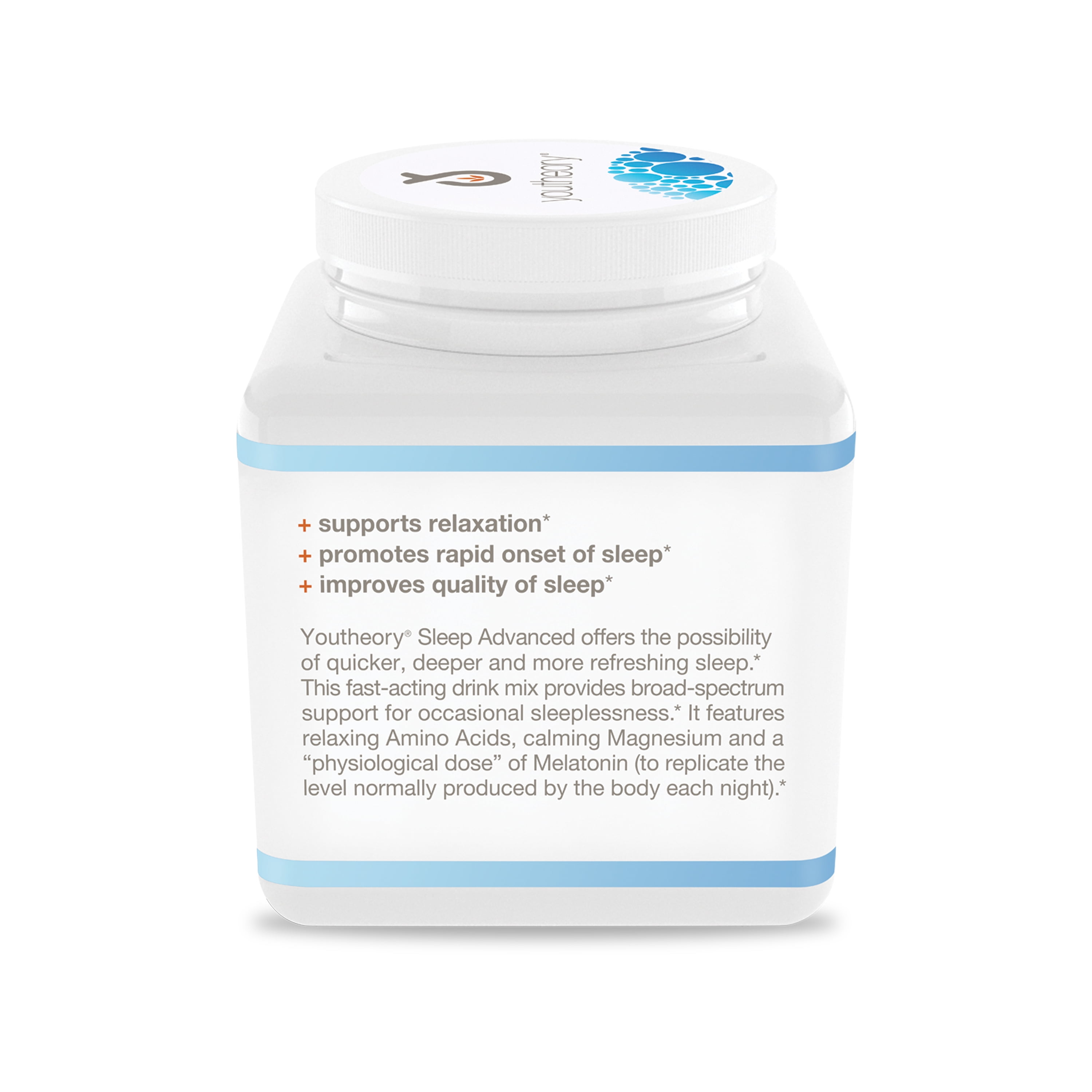 Youtheory Sleep Night Time Powder offers the possibility of quicker, deeper and more refreshing sleep. This fast-acting drink mix provides broad-spectrum support for occasional sleeplessness. It features relaxing Amino Acids, calming Magnesium and a "physiological dose" of Melatonin (to replicate the level normally produced by the body each night).*