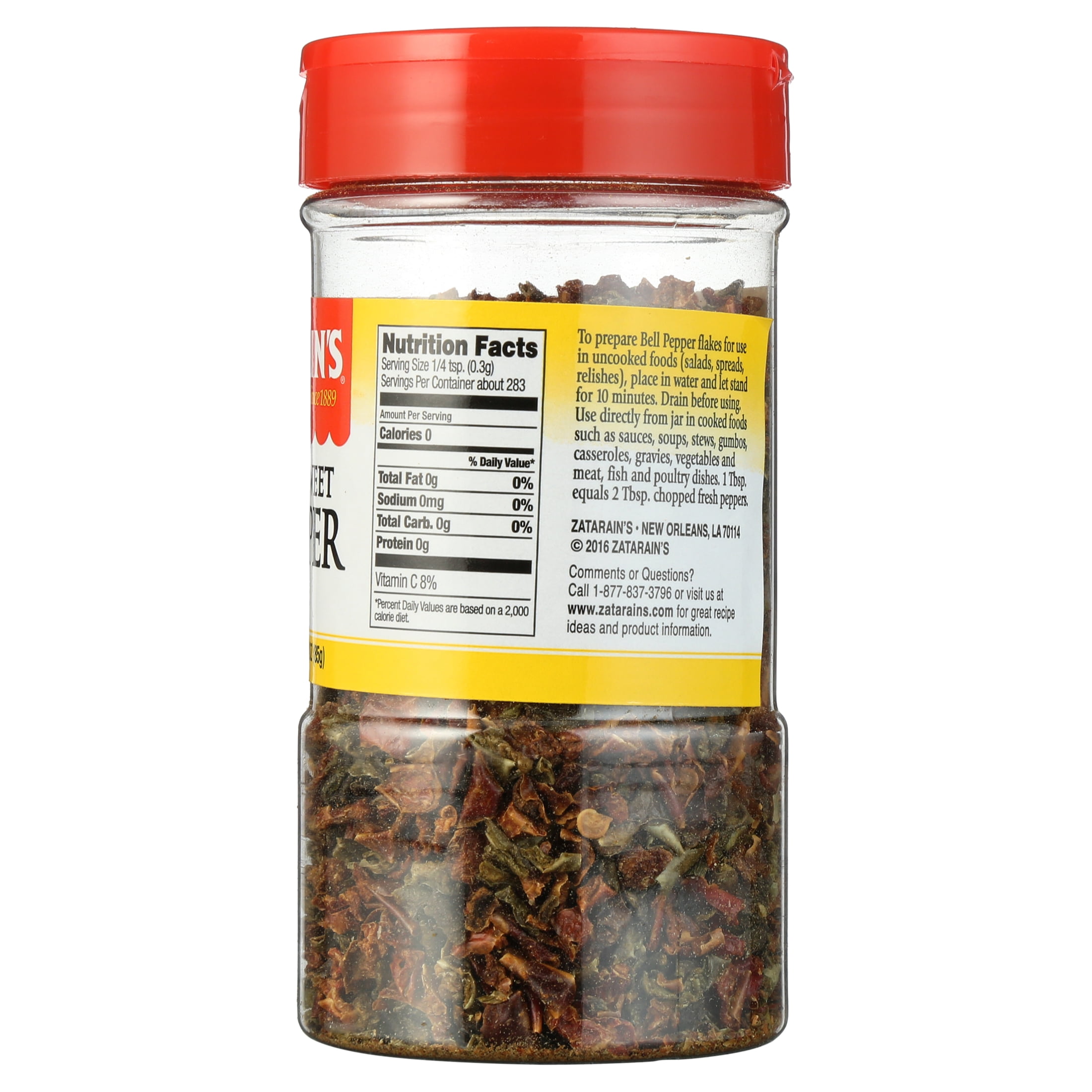 Fresh, high quality, All Natural red and green bell peppers add a delicious vegetable flavor to any dish. Use directly from the bottle in cooked foods such as gumbos, casseroles and eggs.Zatarain’s Seasoning, Dehydrated Sweet Bell Pepper, 3 Oz
