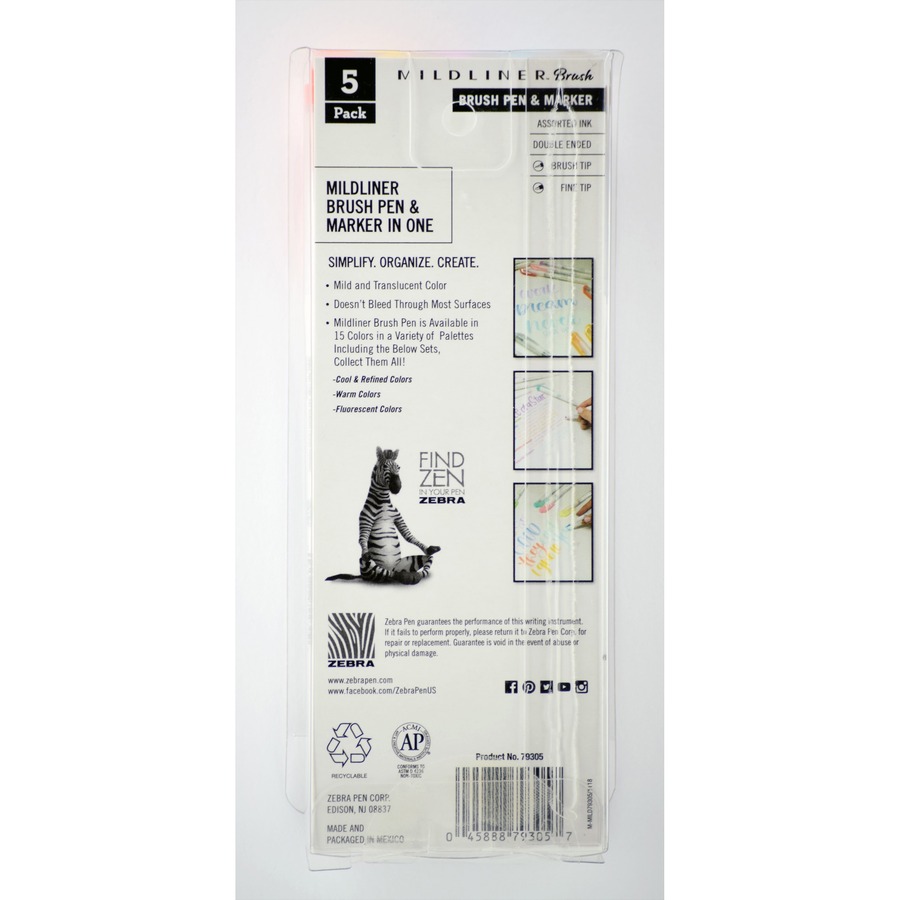 Mildliner marker set includes 5 double-ended markers with brush and fine tips. The mild color shows up softly on paper, has water resistant ink, and is translucent. Colors include: Teal, purple, golden yellow, red orange, and brown. Features a stylish white barrel with minimal, clean design and a convenient pocket clip that indicates the brush pen’s color