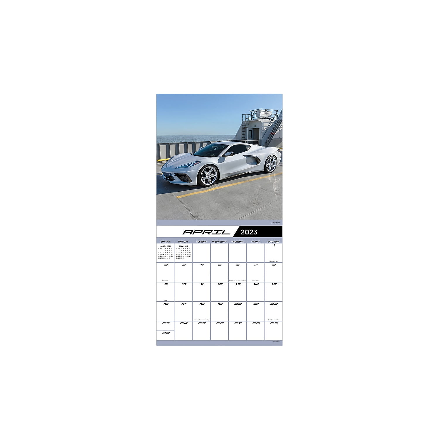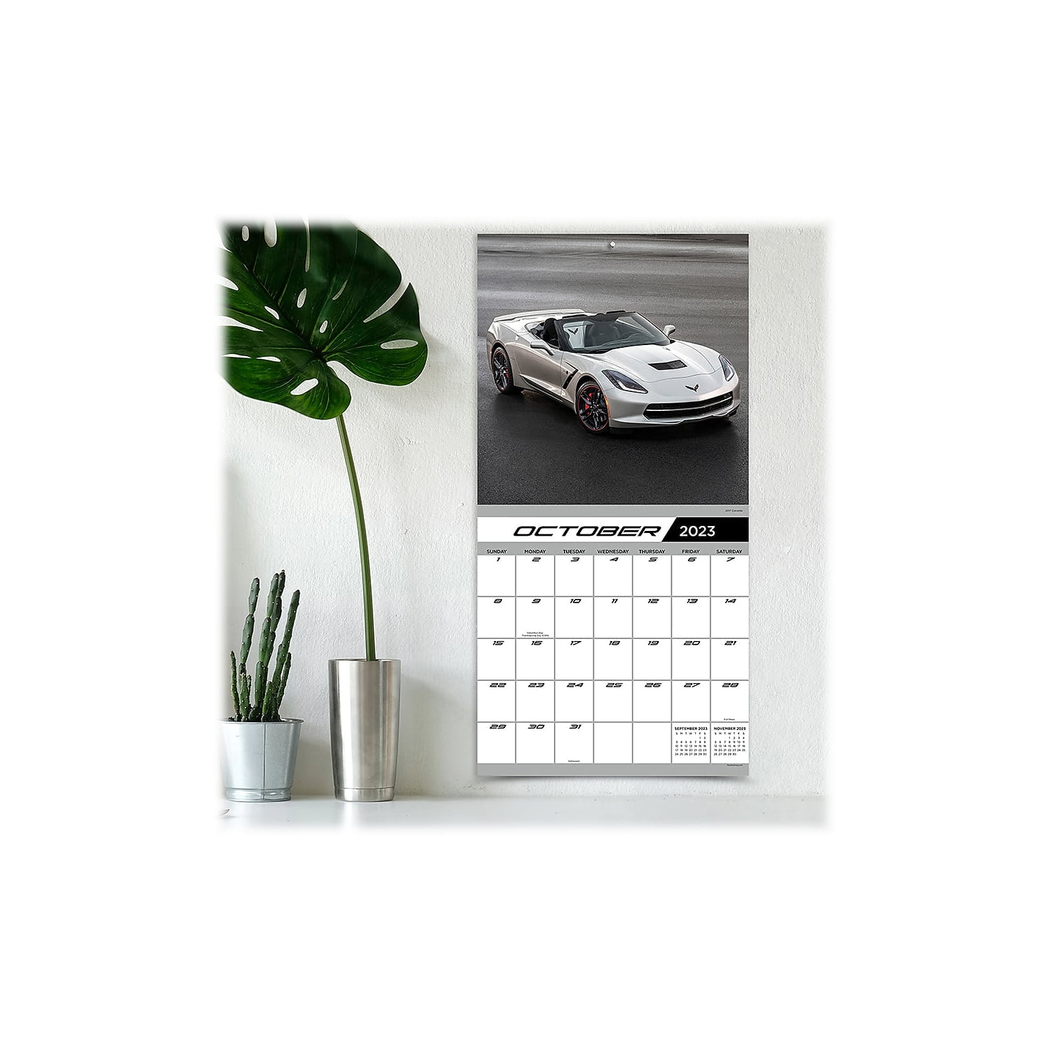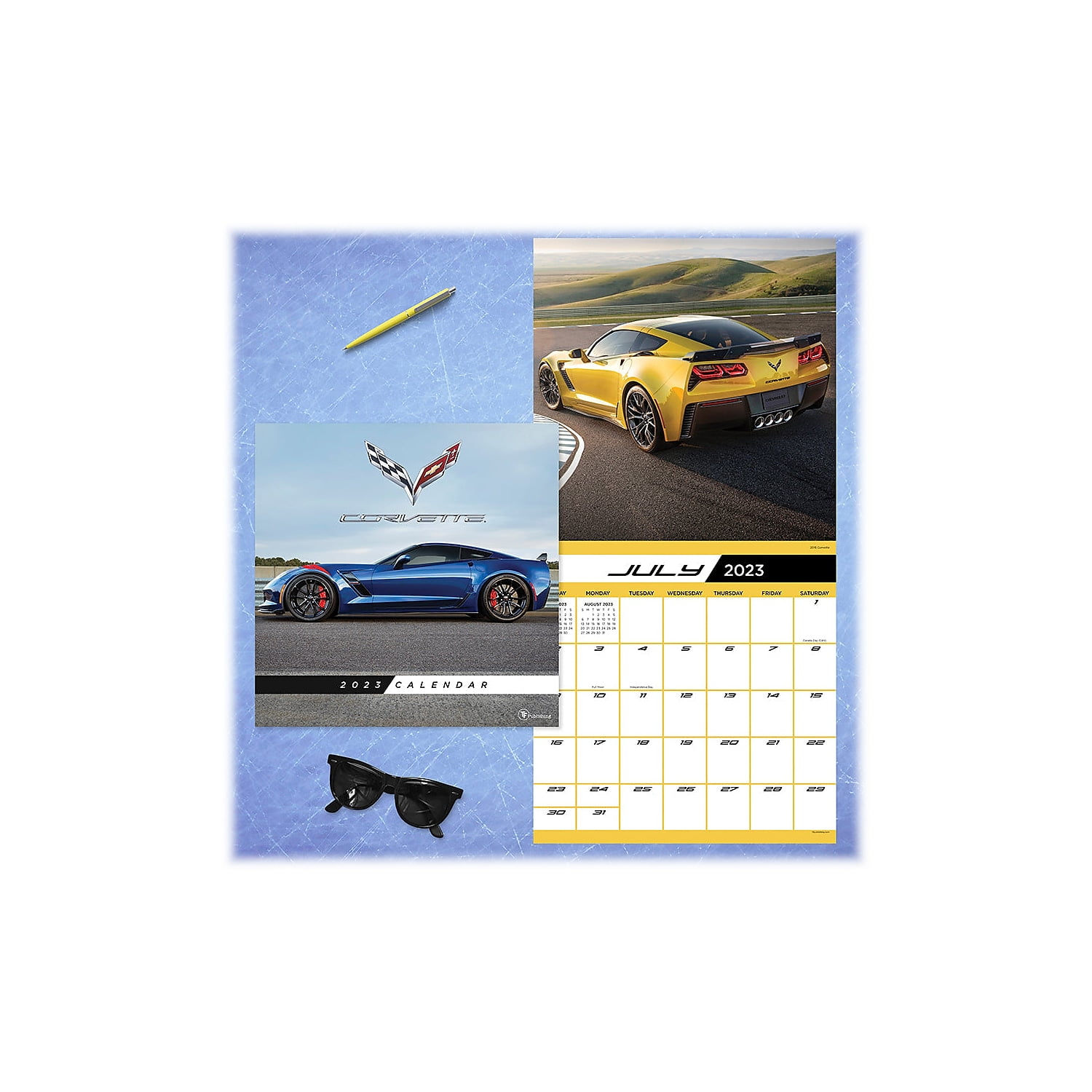 Need for speed. As America’s sports car, Corvettes have been the dream car for car enthusiasts for over 60 years. Each photograph displays what makes a Corvette a modern marvel. This TF Publishing 2023 wall calendar measures 12"" x 12"" and includes 13 full-color images combined with monthly calendar grids and a bonus four-month view of January 2024 through April 2024. Printed on premium gloss paper. Decorative wall calendar for 2023 is a perfect decoration for your room and a great way to keep you focused on your daily goals. Dimensions: 12"" x 12"". One month per view offers large monthly grids with ample room for jotting notes, birthdays, and reminders. Covers 16 months, featuring two-page spreads for January 2023 to December 2023 and a bonus spread for January 2024 to April 2024. Design: Corvette. Printed on premium gloss paper. Includes US and international holidays. Sold as 1 Each.