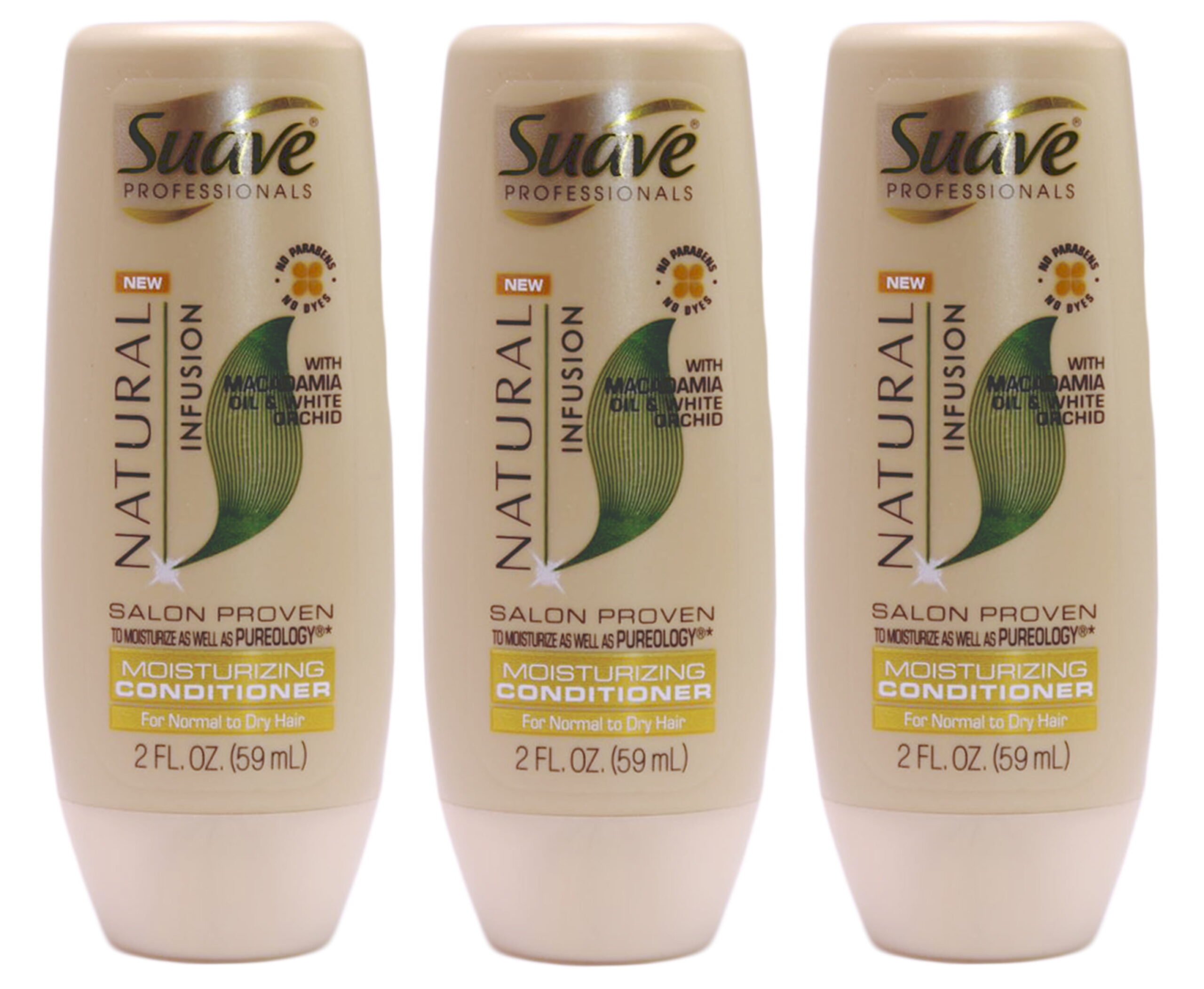 With macadamia oil & white orchid. No parabens. No dyes. Safe for color treated hair. Salon proven to moisturize as well as Natural Infusion Moisturizing Conditioner: Enriched with special exotic natural ingredients, this range of products delivers noticeable hair benefits. Products contain no parabens. No dyes. This moisturizing conditioner infused with macadamia oil & white orchid, conditions hair and weightlessly seals the cuticle from root to tip for long lasting moisture and smoothness. Moisturizing System with Macadamia Oil & White Orchid: 10x more moisturization (vs. non conditioning shampoo); softer, smoother look (vs. non conditioning shampoo); luxurious nature inspired fragrance. Visit www.suave.com. Made in USA….3 Suave Natural Infusion Macadamia Oil Salon Moisturizer Conditioner Travel 2 Oz