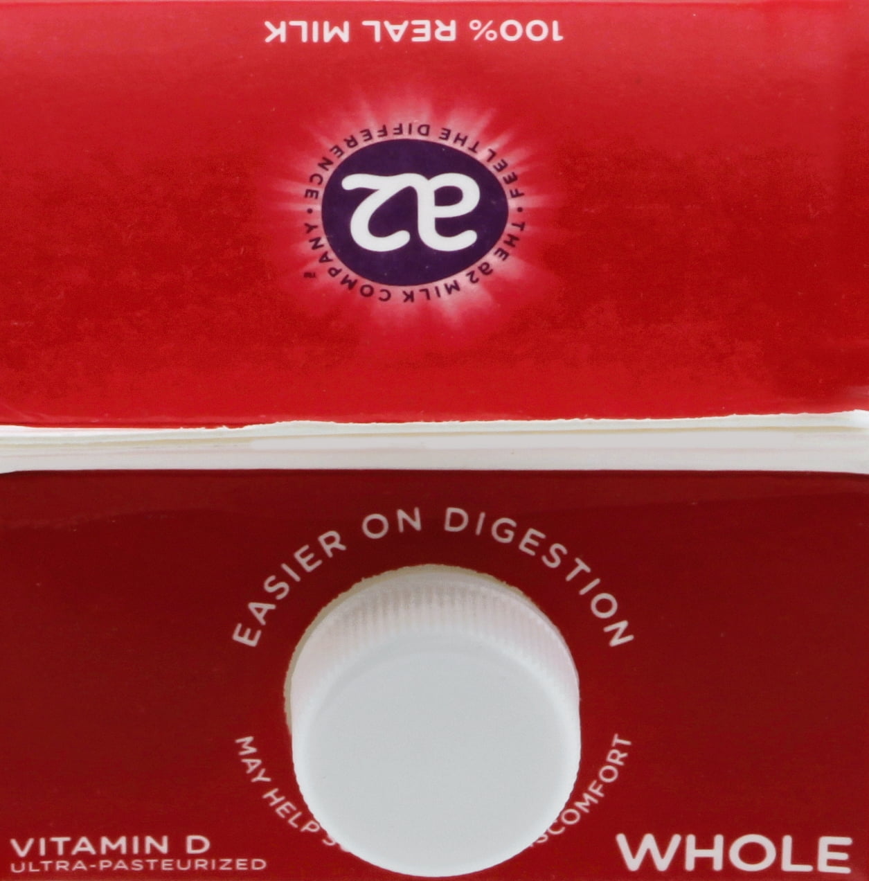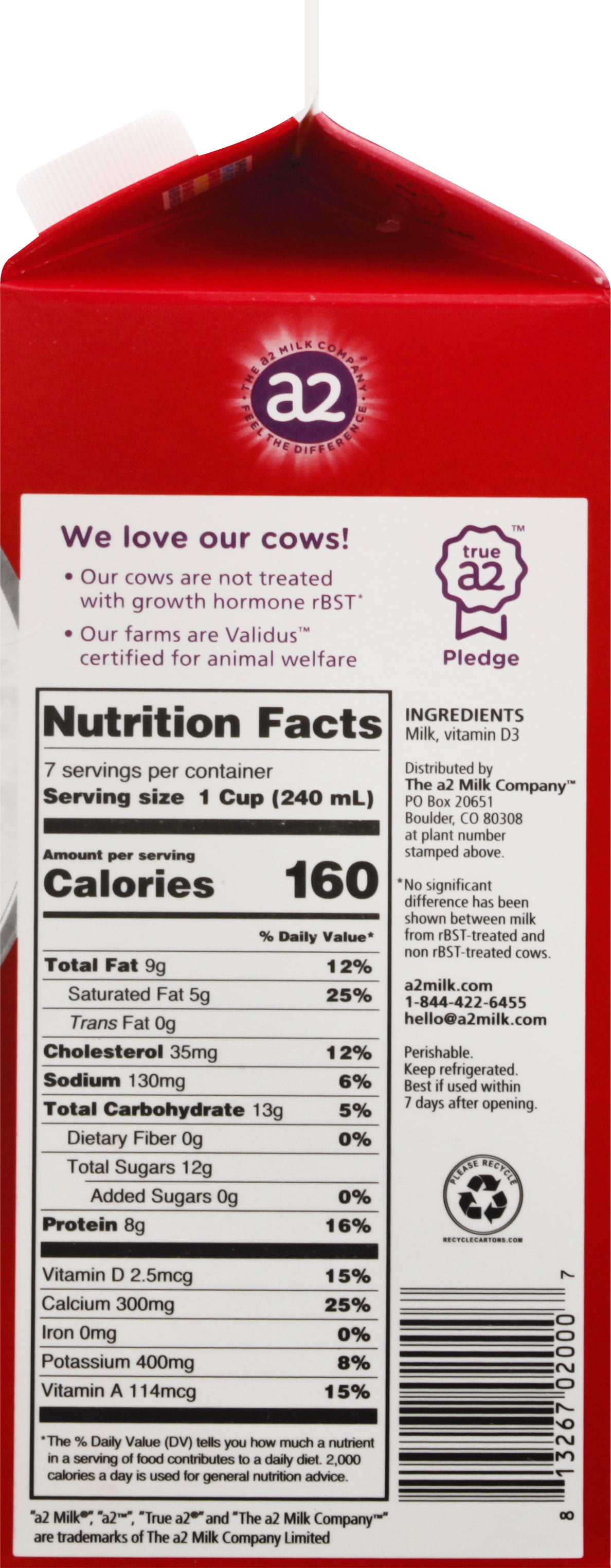 The a2 Milk Company. Feel the difference. Naturally contains A2 protein (The a2 Milk difference. a2 Milk comes from cows that naturally produce only the natural A2 protein and no A1. Published research suggests a2 Milk may help avoid stomach discomfort in some people). Easier on digestion. May help some avoid discomfort. No artificial growth hormones (No significant difference has been shown between milk from rBST-treated and non rBST-treated cows). Real. 100% real milk. We love our cows! Our cows are not treated with growth hormone rBST (No significant difference has been shown between milk from rBST-treated and non rBST-treated cows). True a2 pledge. Grade A. a2milk.com. Animal welfare review. ValidusCertified.com. Our farms are Validus certified for animal welfare. Please recycle. recyclecartons.com.