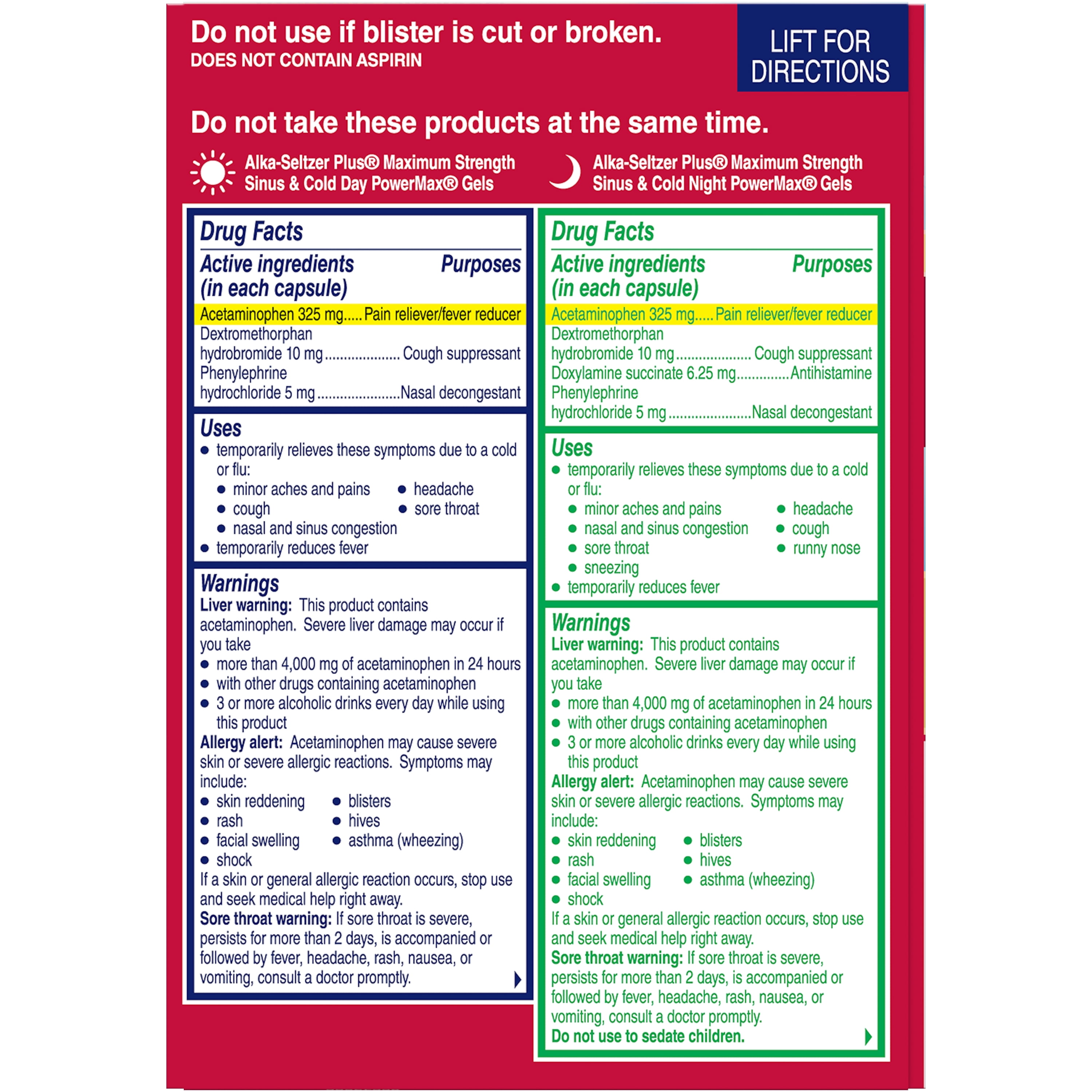 Maybe it starts with the sniffles,a headache and a little sinus pressure. Before you know it, you’re battling multiple symptoms during the day and not getting the rest you need at night. Alka-Seltzer Plus Maximum Strength Sinus & Cold Day & Night PowerMax Gels deliver concentrated powerful relief in a 25% smaller pill*. In one convenient package, get fast relief of: Day: Nasal & Sinus Congestion, Headache, Body Ache, Sore Throat, Sinus Pressure, Cough and Night: Nasal & Sinus Congestion, Runny Nose, Sneezing, Headache, Sore Throat & Cough