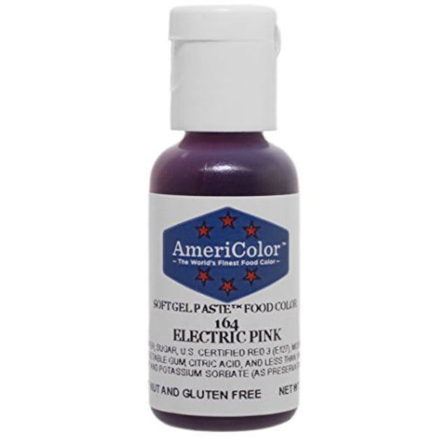 AmeriColor Soft Gel Paste™ is the first choice of top decorators worldwide. With more than 50 colors to chose from, AmeriColor has the perfect color for your project, with deep, vivid colors that have no aftertaste!AmeriColor Soft Gel Paste™ will color royal icing, buttercream, rolled fondant, macarons, cookie dough, bread dough, cake batter, whipped toppings & icings, gum paste, marzipan, pastillage and white chocolate (with addition of Flo-Coat). Soft Gel Paste™ is peanut, tree nut, soy, and gluten free. It is also Kosher certified.Need to get the same shade every time you decorate? AmeriColor squeeze bottles with flip-top caps allow you to precisely measure your color drop by drop, giving you the same results every time.americolor gel paste food color, electric pink