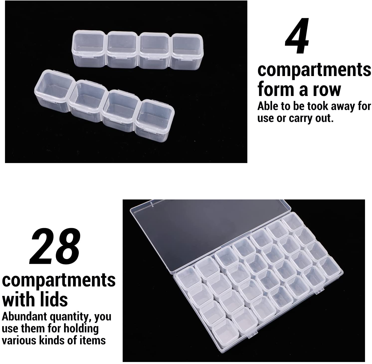 【SMALL SIZE – Detachable Compartments】Total 28 compartments with lids, every 4 compartments form a row while every lid is individual, and any row is able to be took away for use or carry out.