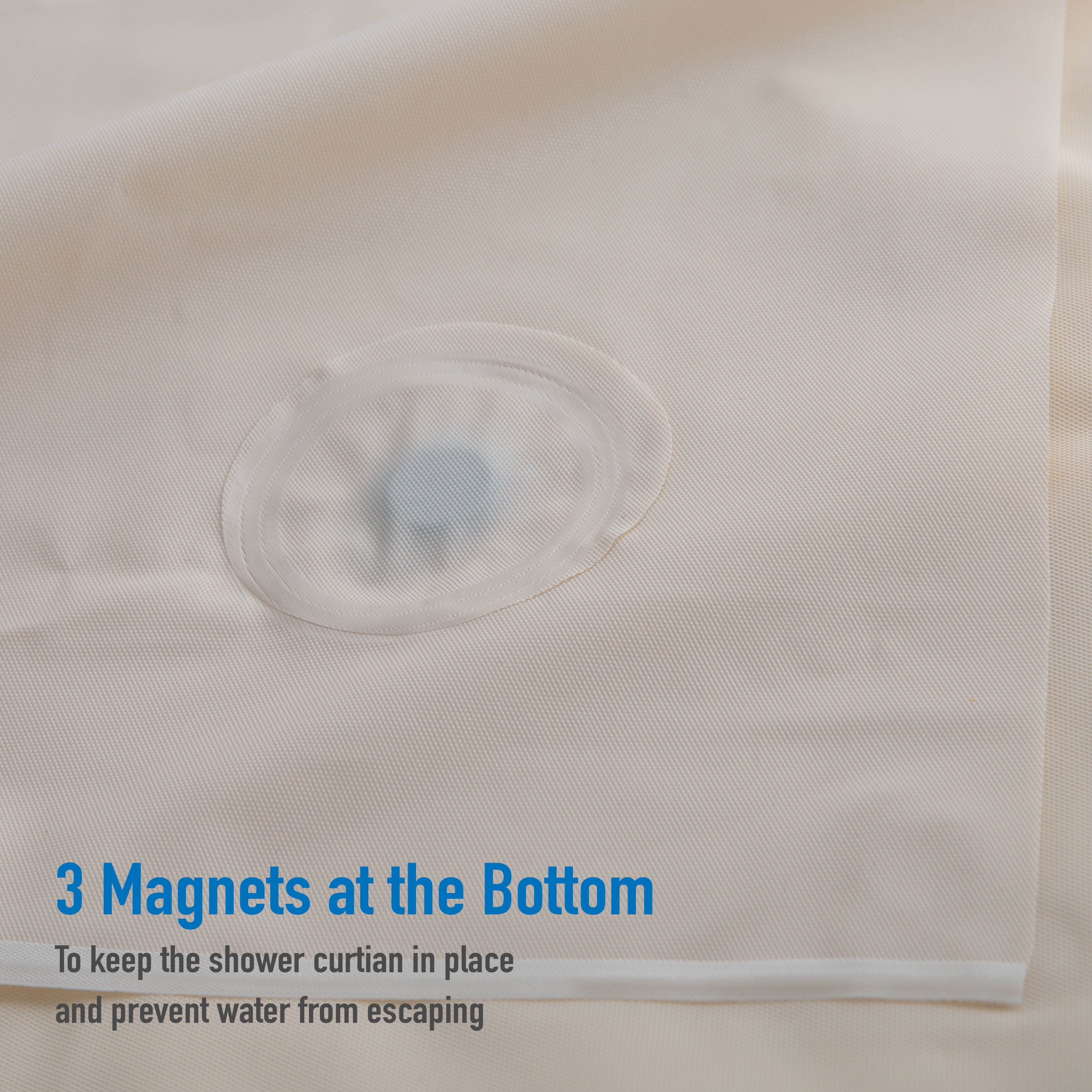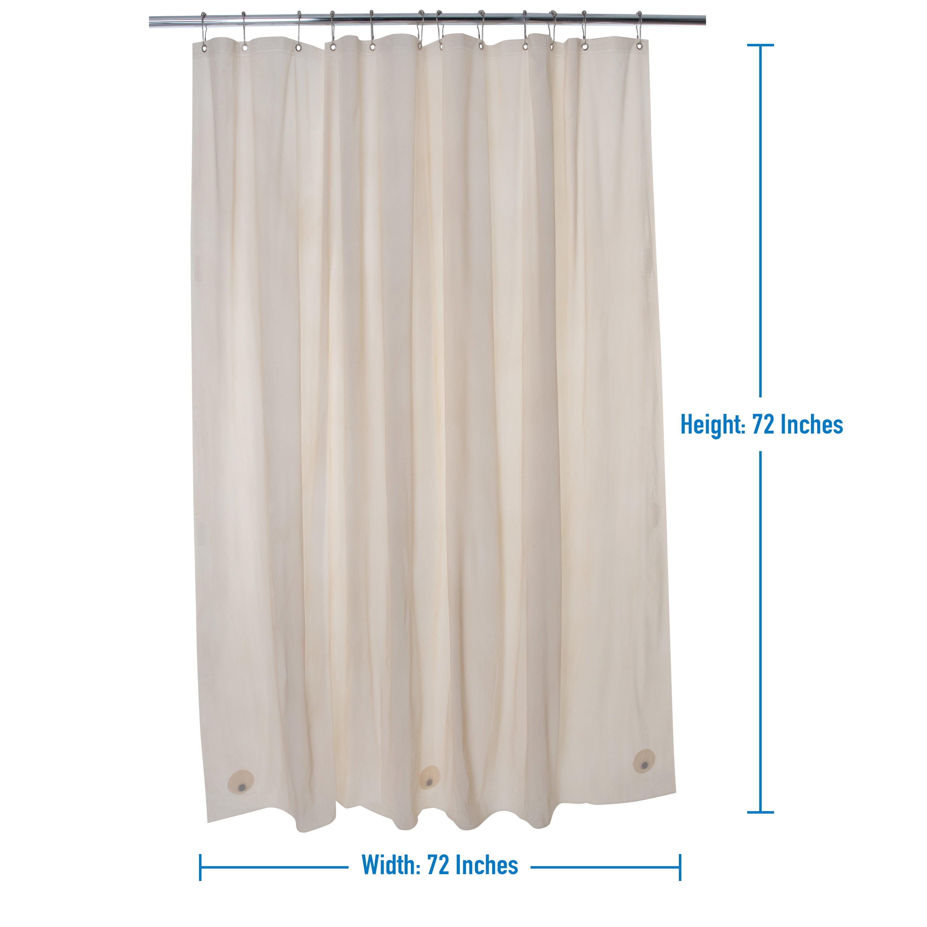 Bath Bliss Splash guard shower liner with metal eyelets grommets includes splash guard suction cups to keep water where it belongs in your tub, three base magnets to keep your liner weighed down and in your tub. 12 Metal reinforced eyelets prevent tears in liner which helps prolong life. Wipes clean with damp cloth. Mildew resistant material. Made of 100% PVC. 5.5 Gauge. Color: clear. Size: 70"x72".