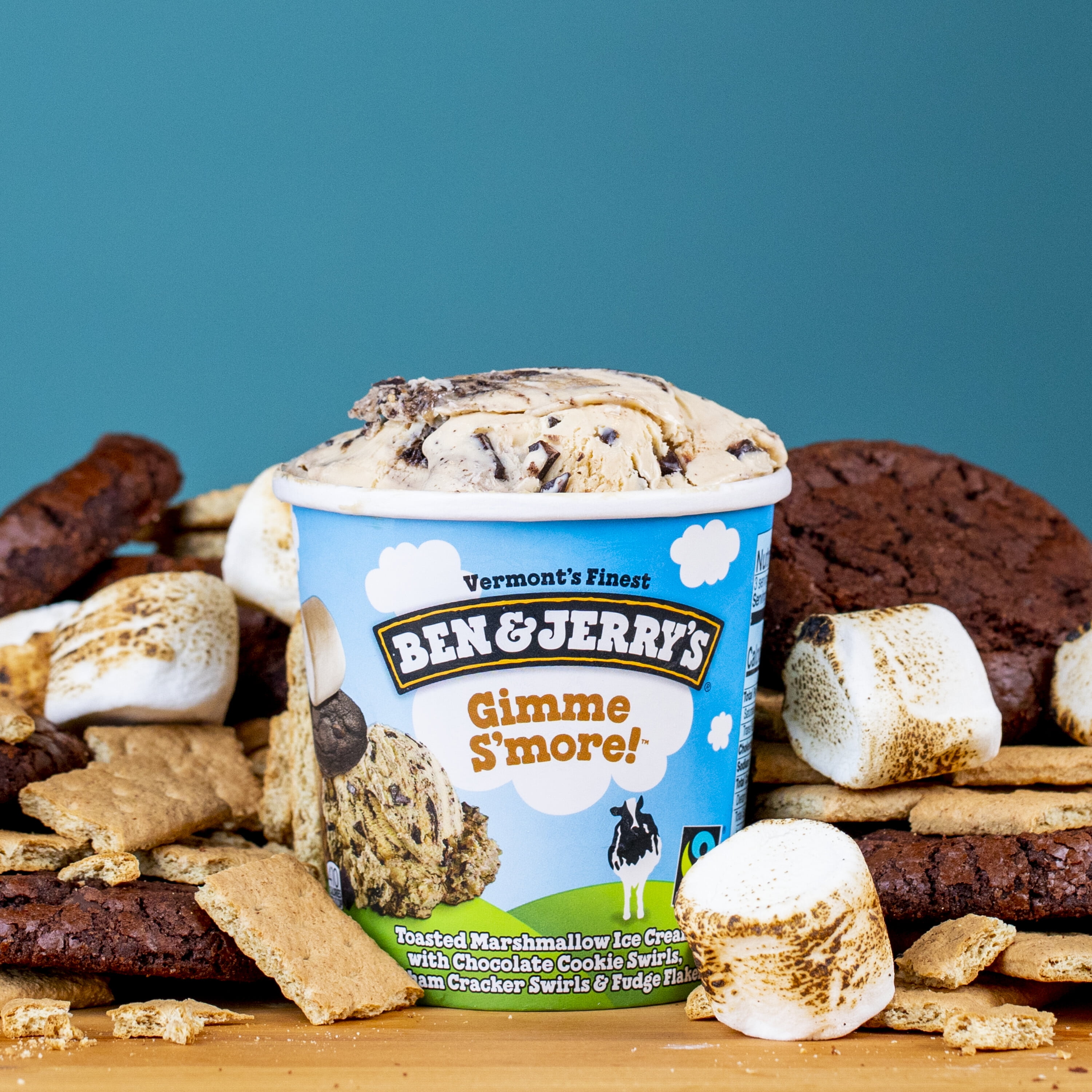 Ben & Jerry’s Toasted marshmallow ice cream with chocolate cookie swirls, graham cracker swirls, and fudge flakes. It’s a gimme: there’s always room for s’more. And because this ‘shmallowy-rich, graham-good-‘n-chocolatey concoction is now available as a full-time flavor, there’s even s’more reason to stock up! There are times in life where it’s prudent to share. When you’re splitting a bag of popcorn with your date at the movies, for example. Or when you simply need another living, breathing human being to split the cost of paying rent. But there are other times when you need to carve out a section of life that is MINE, ALL MINE. When you should just go ahead and be selfish. Campfire-roasted s’mores are a perfect example. Sure, you could toast two marshmallows on a stick. You could break that graham cracker in two. But why on earth would you?! Nope. We firmly believe that s’more are a one-person snack. So we advocate scooping up your own dish of Gimme S’more before helping others. Sure, that might not make you popular with your date. But we think it’s worth holding the line here. However, we do share the wealth with our partners by using Fairtrade Certified sugar, cocoa, and vanilla and using eggs from cage-free hens. Plus, our ingredients are non-GMO-sourced, for a flavor you can feel good about eating—whether you share it or not.