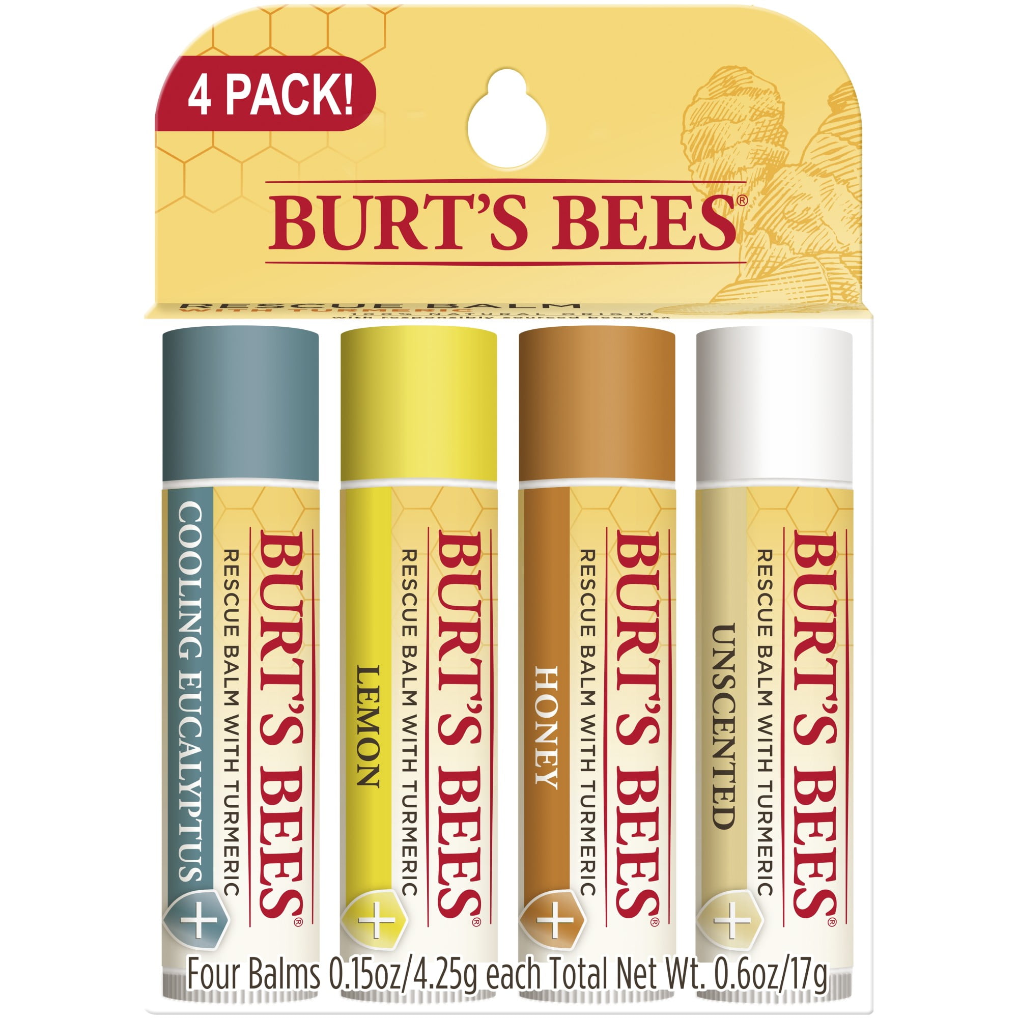 Burt’s Bees Rescue Lip Balm, Cooling Eucalyptus, Lemon, Honey, Unscented, 4 Tubes