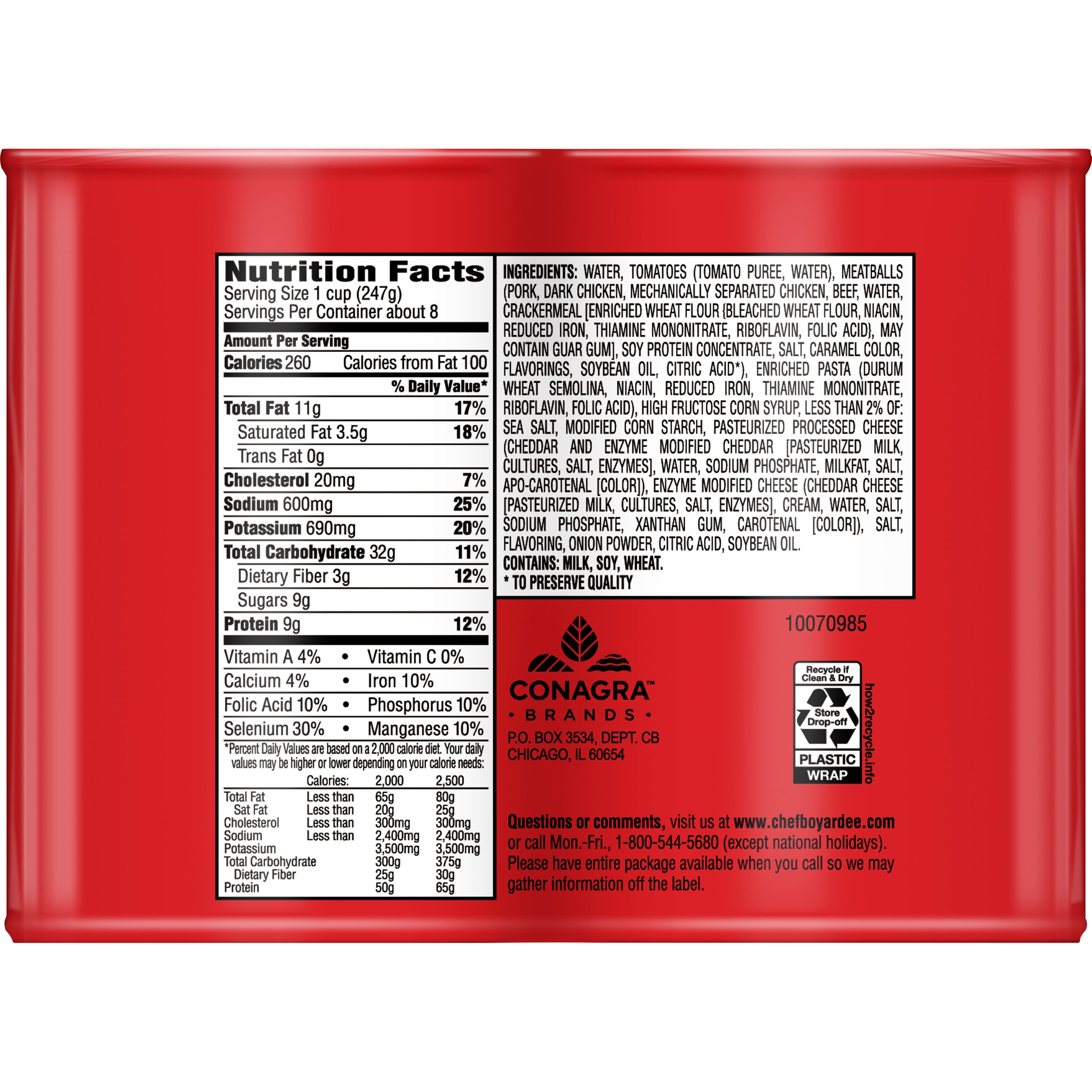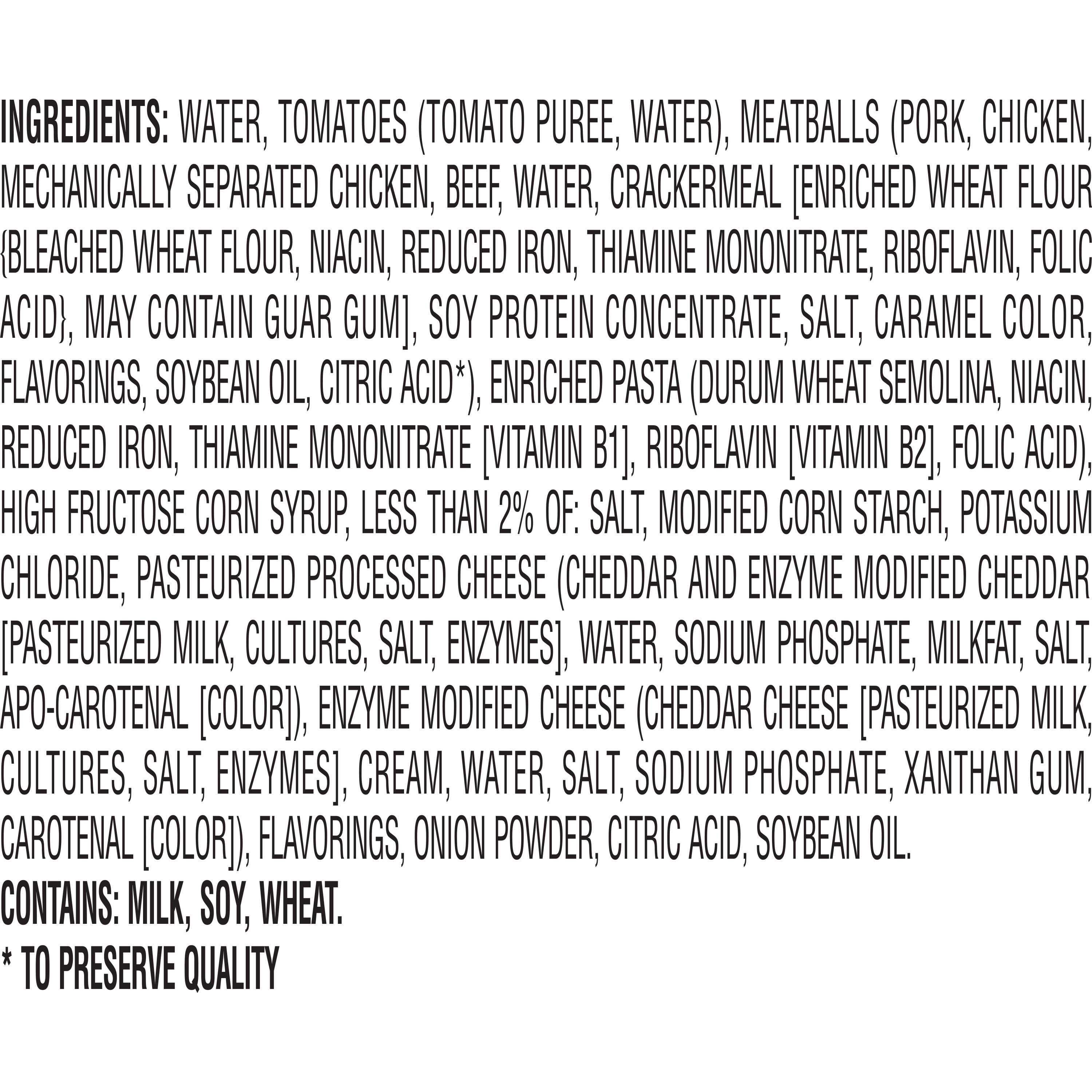 - Chef Boyardee uses enriched pasta, mini meatballs made with beef, pork, and chicken, and a robust tomato sauce to give Mini ABC’s and 123’s with Meatballs the classic taste your family will ask for again and again