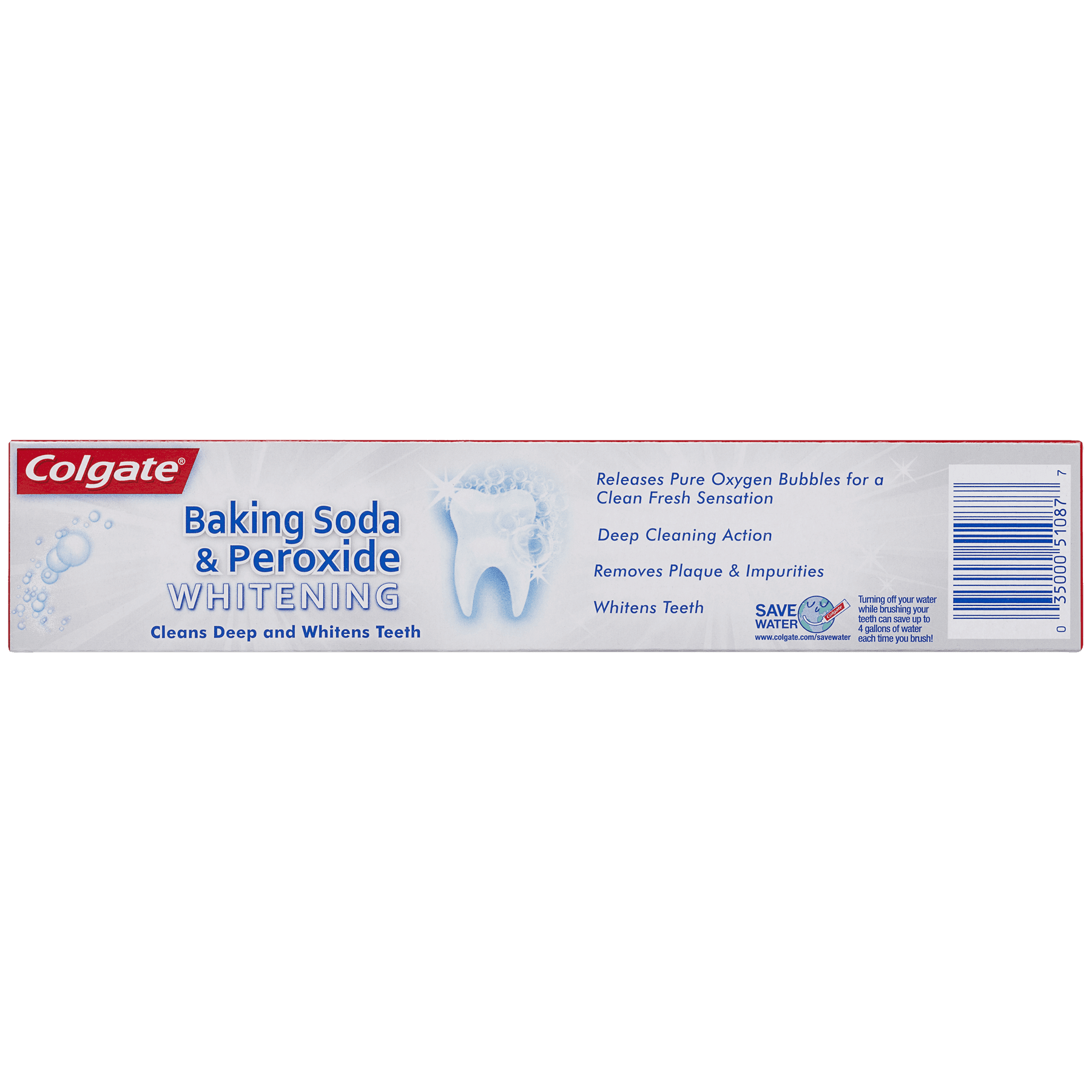 Colgate Baking Soda and Peroxide Whitening Toothpaste, with a great Brisk Mint flavor, refreshes & cleans for whiter teeth. This whitening toothpaste cleans deep, preventing cavities and the build-up of tartar. Our unique formula releases pure oxygen bubbles every time you brush your teeth for a clean, fresh sensation. This baking soda and peroxide whitening toothpaste has a Brisk Mint flavor that freshens breath.