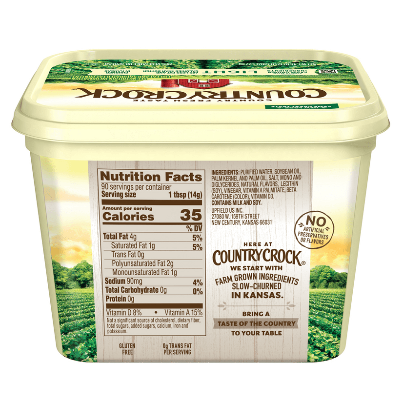- NO UNNECESSARY INGREDIENTS: Country Crock Light Buttery Spread is free of gluten and hydrogenated oils, and has 0g cholesterol and trans fat per 1 tbsp serving
