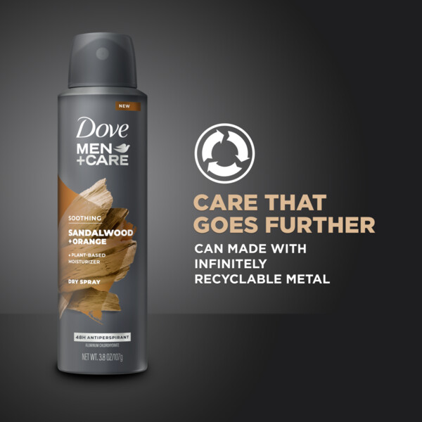 - New Dove Men+Care Sandalwood + Orange Antiperspirant dry spray for men who want a product that works while soothing your skin