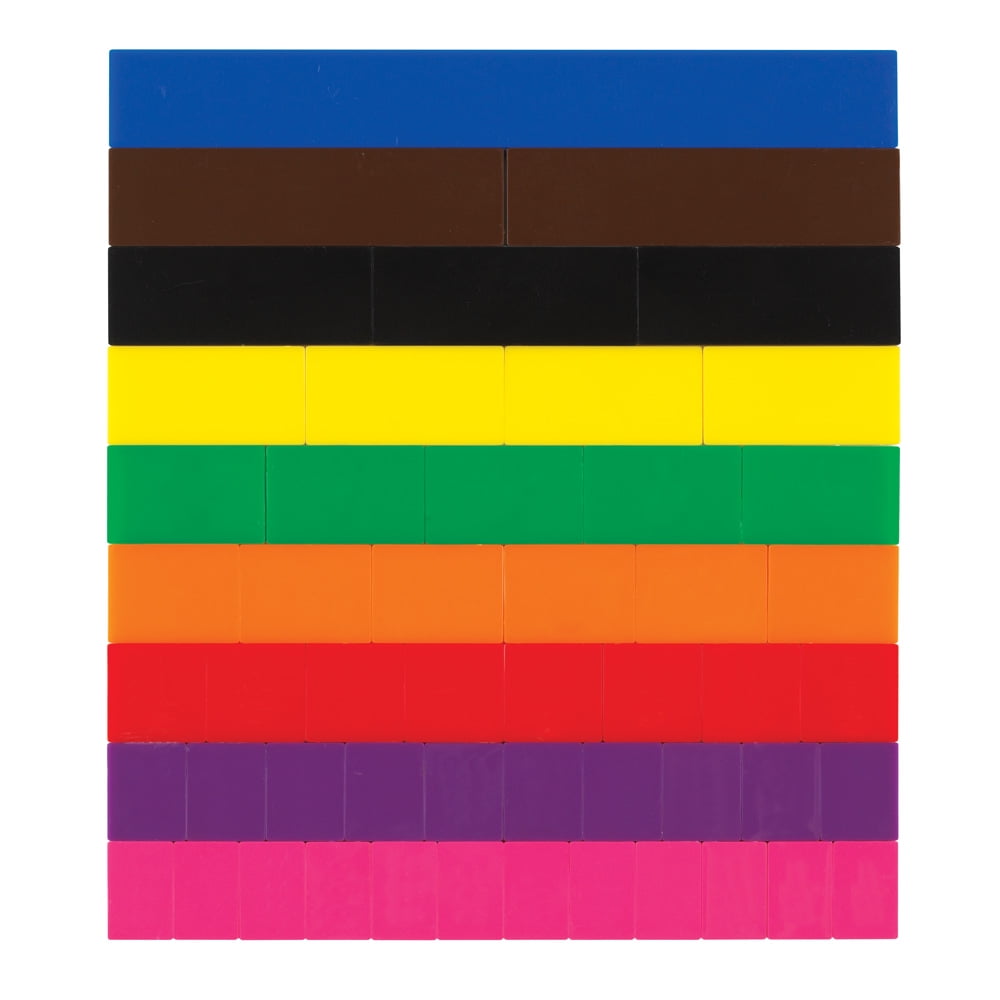 Nine-colorful blank proportional tiles representing 1 1/2 1/3 1/4 1/5 1/6 1/8 1/10 and 1/12. This 51 piece set comes packed in a plastic bag for convenient storage.