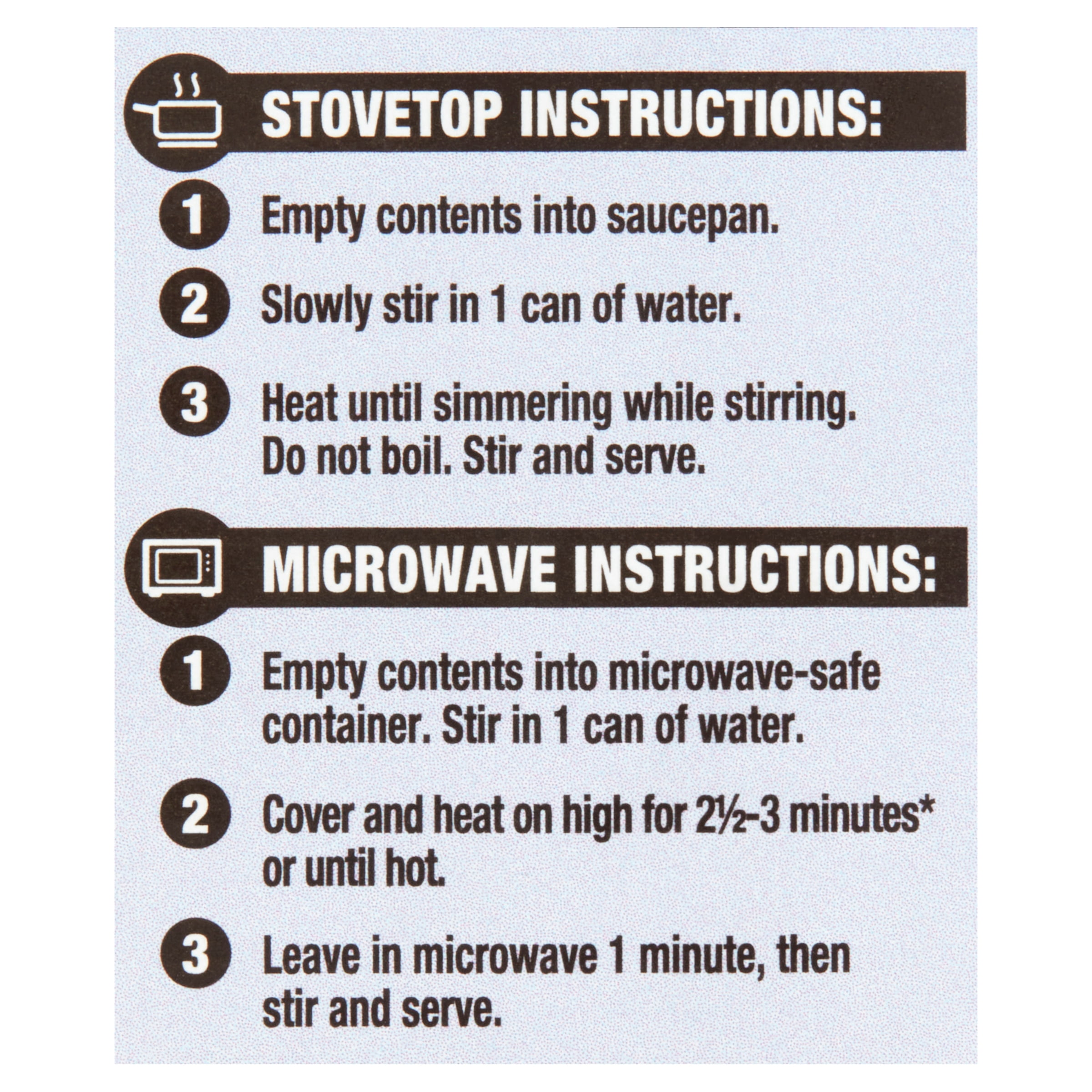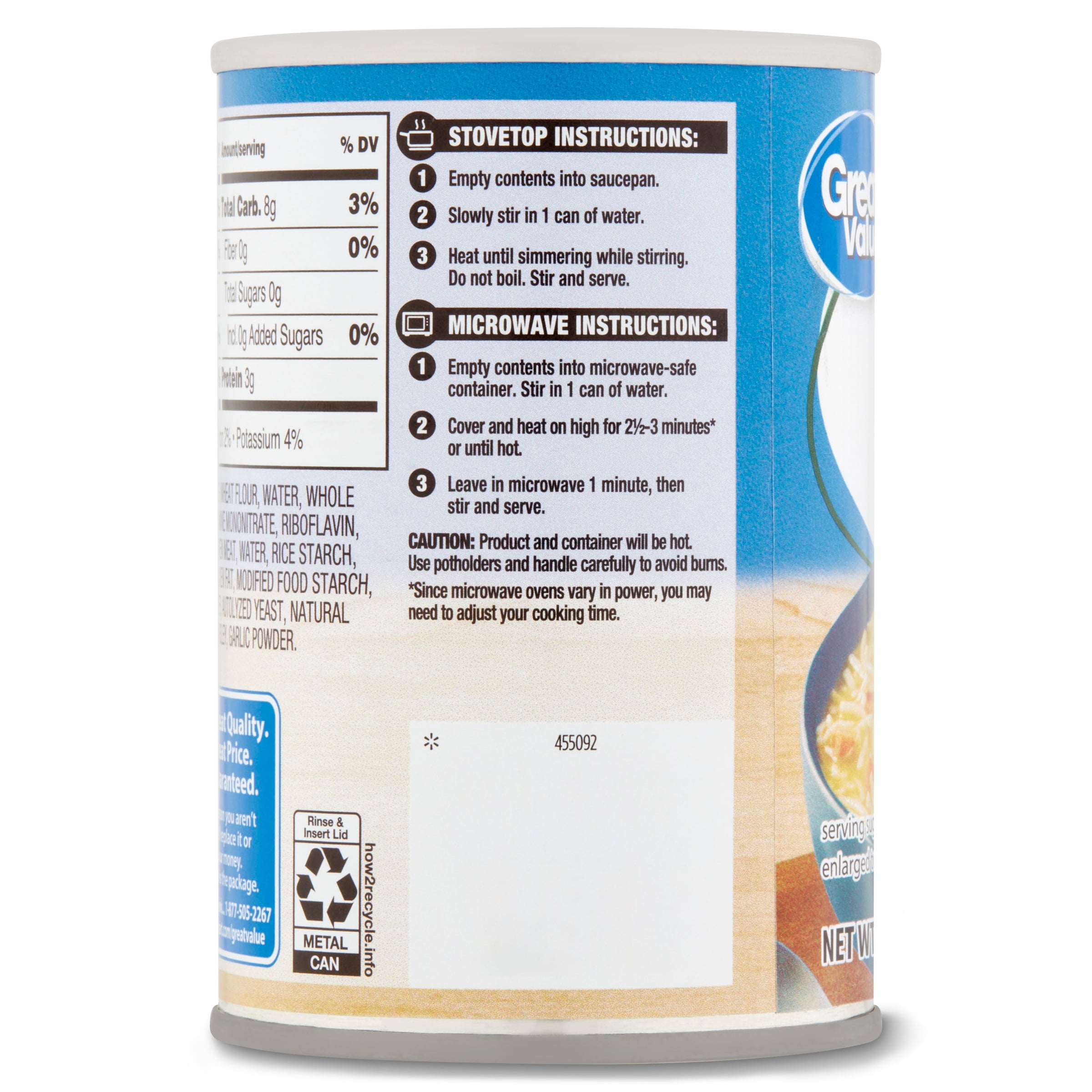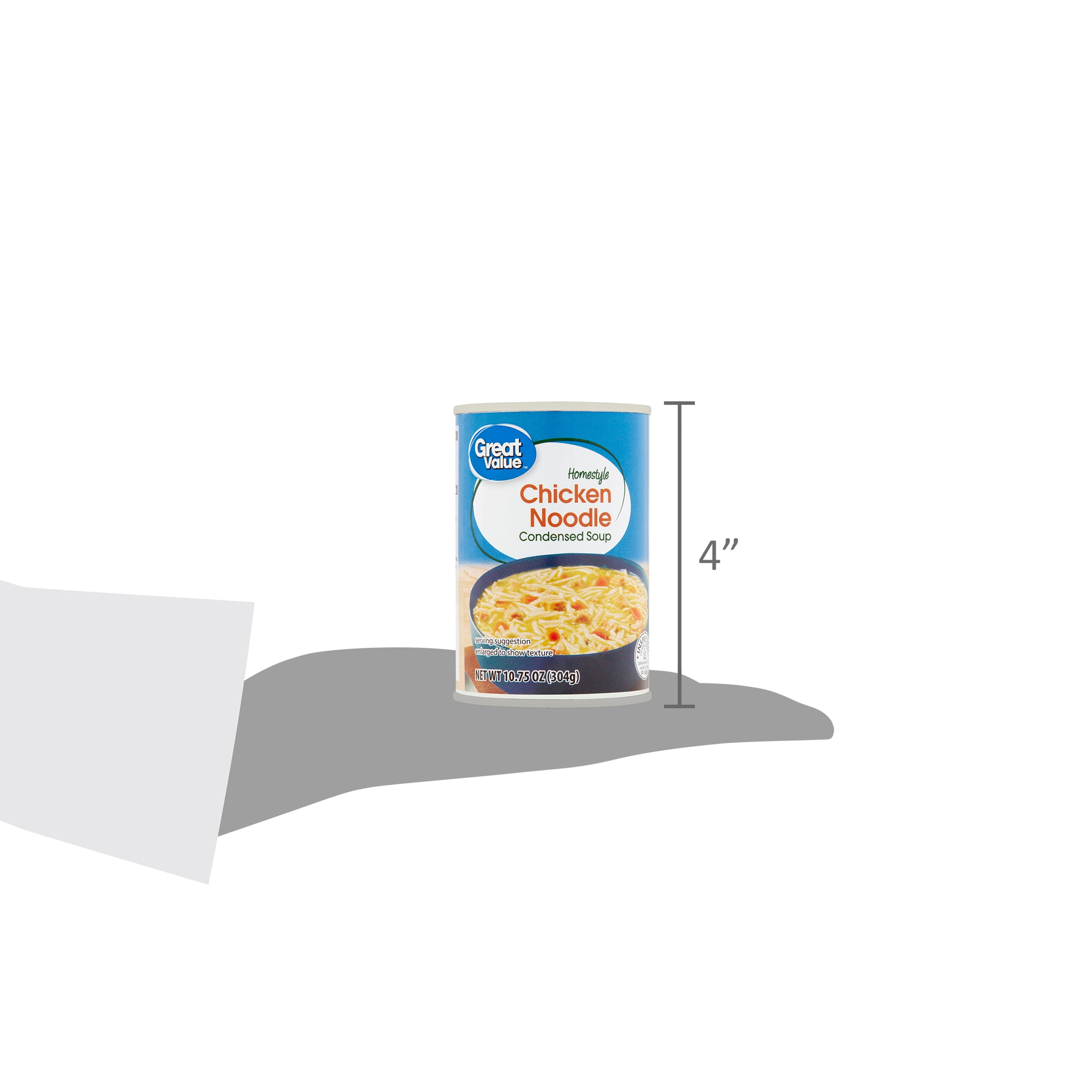 Indulge in a delicious classic with the Great Value Homestyle Chicken Noodle Condensed Soup. This low-fat treat is loaded with cooked chicken meat and hearty noodles in a savory chicken broth. Great Value soup is the perfect way to warm up on a cold winter’s day. It is great for quick and easy meals at home or at the office. You can heat it up in the microwave or on top of the stove. The soup comes in a can with an easy open pull tab so you can simply pour the soup into a saucepan or microwave safe bowl, add one can of water and heat as desired. Each 10.5 oz container of Great Value chicken noodle soup is inspected by the USDA, is low in cholesterol and contains 0g trans-fat per serving. Enjoy the wholesome flavor of Great Value Homestyle Chicken Noodle Condensed Soup.