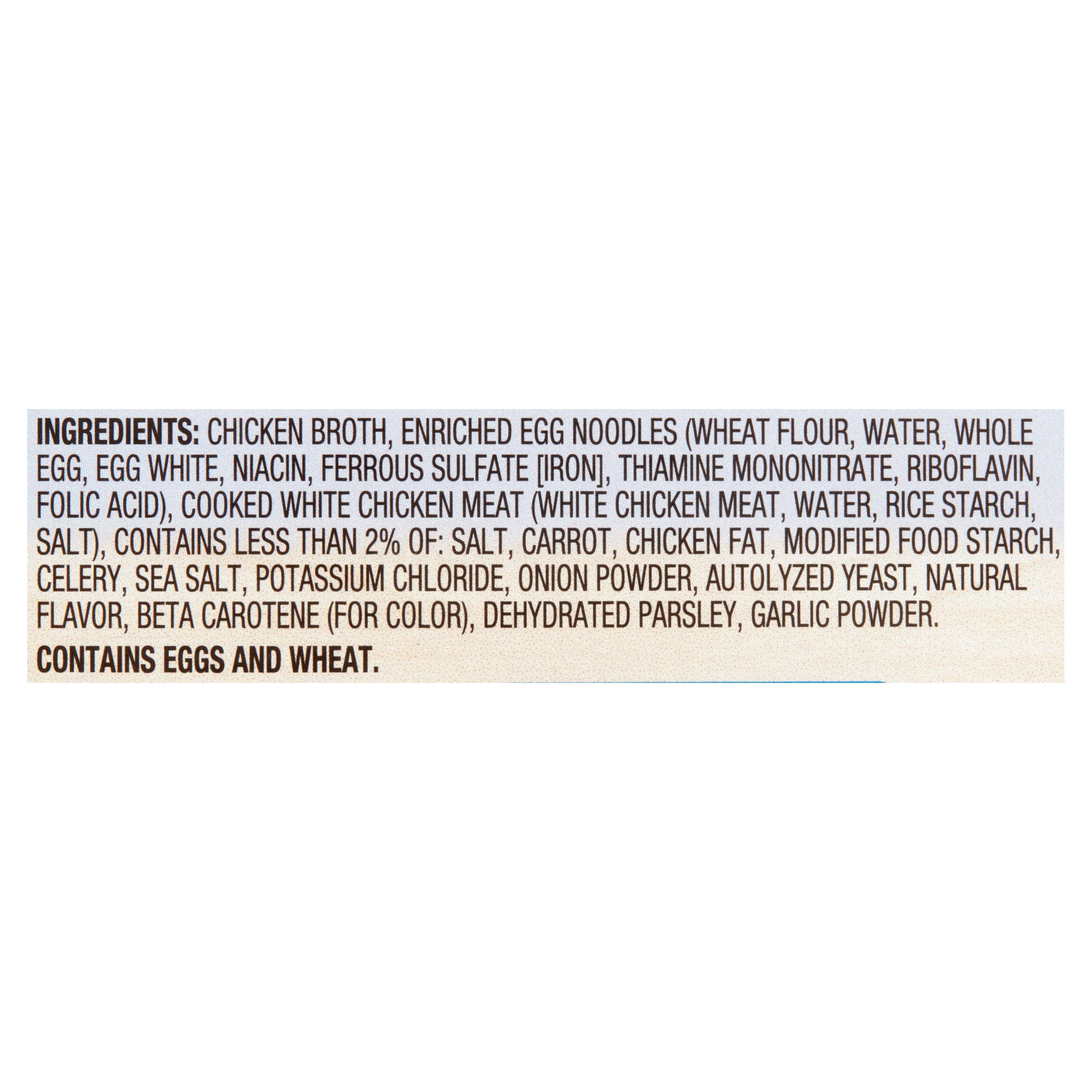 - Loaded with cooked chicken meat and hearty noodles in a savory chicken broth