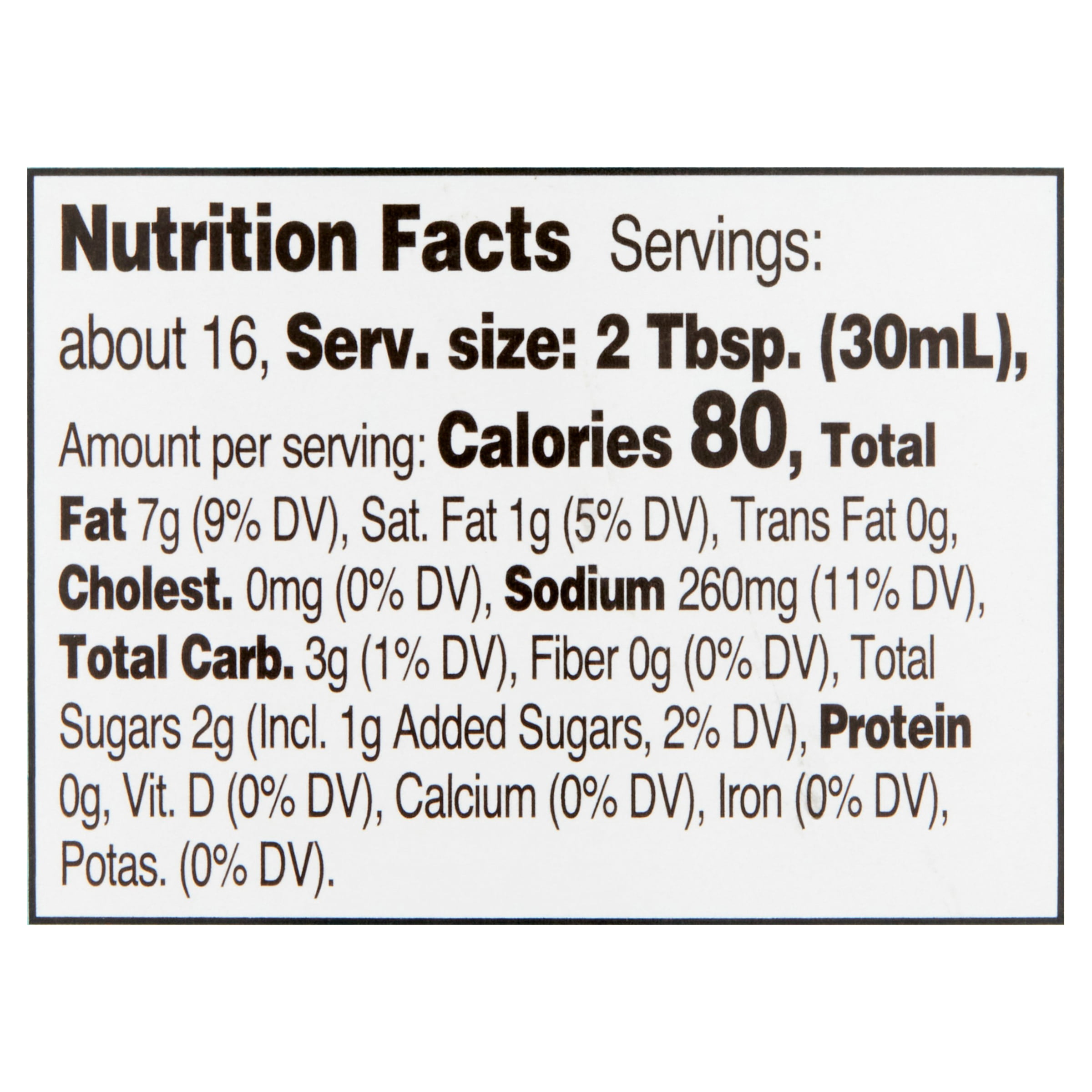 This product contains 80 calories and 7g fat per serving. Our regular classic ranch contains 130 calories and 14g fat per serving.