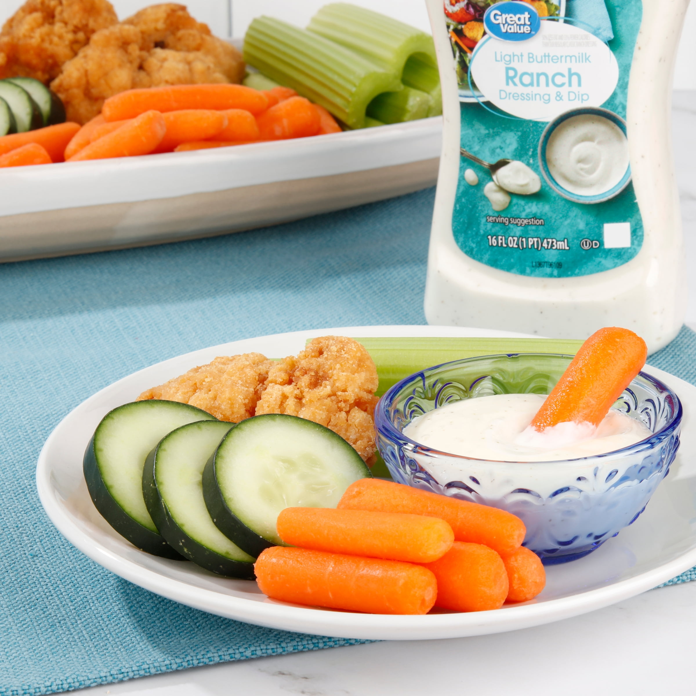 Great Value Light Buttermilk Ranch Dressing & Dip gives you the flavor of your favorite creamy ranch guilt-free. This light buttermilk ranch has 50% less fat and 33% fewer calories than our regular classic ranch dressing. Our unique blend of buttermilk, oils, choice seasoning and spices makes this delicious dressing great for salads and dips. Try drizzling this yummy condiment on chicken nuggets, boardwalk fries, buffalo wings, potato skins, or even pizza! You can also create hundreds of your own homemade sauces, dips, or spreads. Toss together your favorite salad and drizzle this dressing to make a tasty and nutritious meal. Great Value Buttermilk Ranch Dressing & Dip also complements sandwiches, wraps, and burgers. Our dressing comes inside a reclosable squeeze bottle making it easy and convenient to dispense how much you want while keeping it fresh after every use. Add a rich and creamy taste to any meal with Great Value Light Buttermilk Ranch Dressing & Dip.