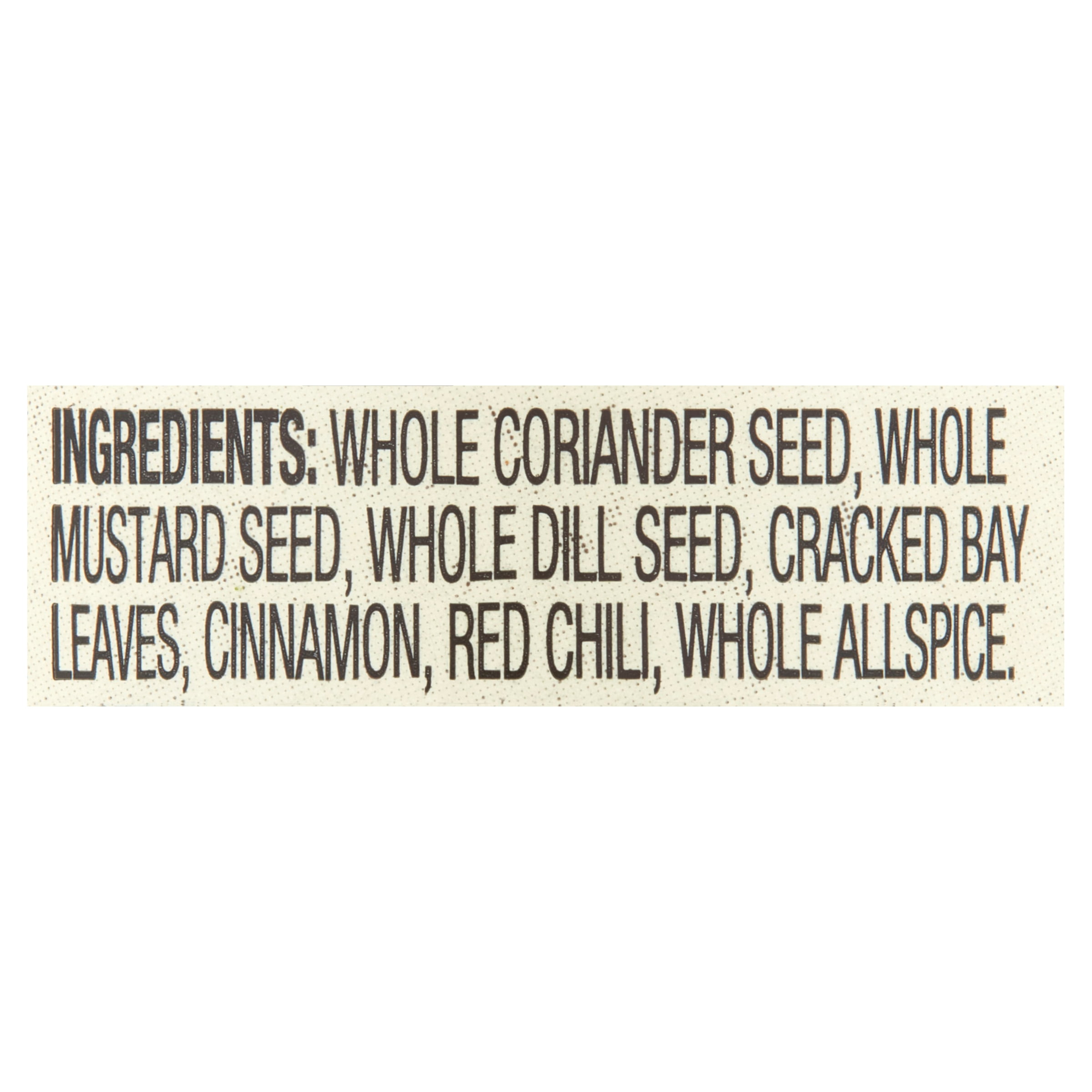 - Combination of whole coriander seed, whole mustard seed, whole dill seed, bay leaves, cinnamon, red chili, and whole allspice