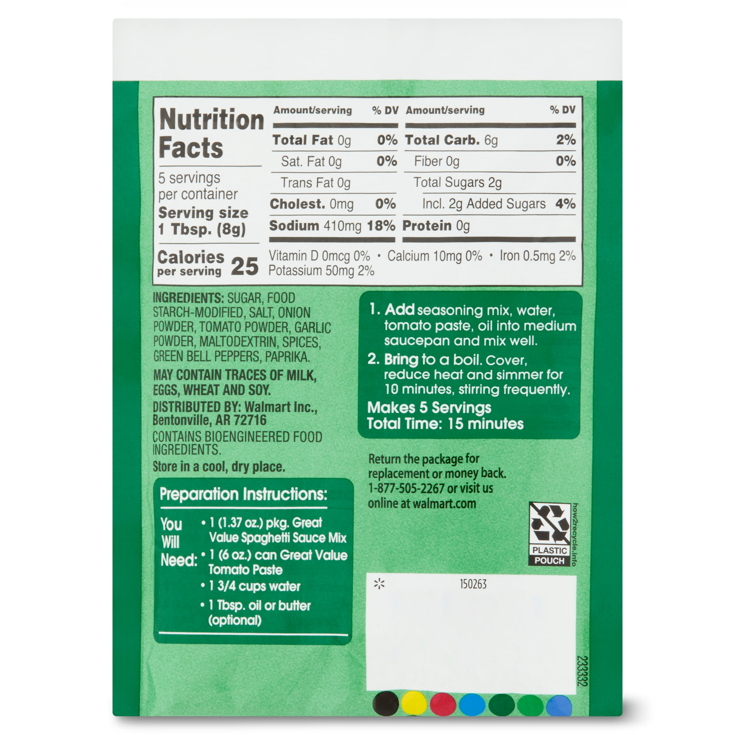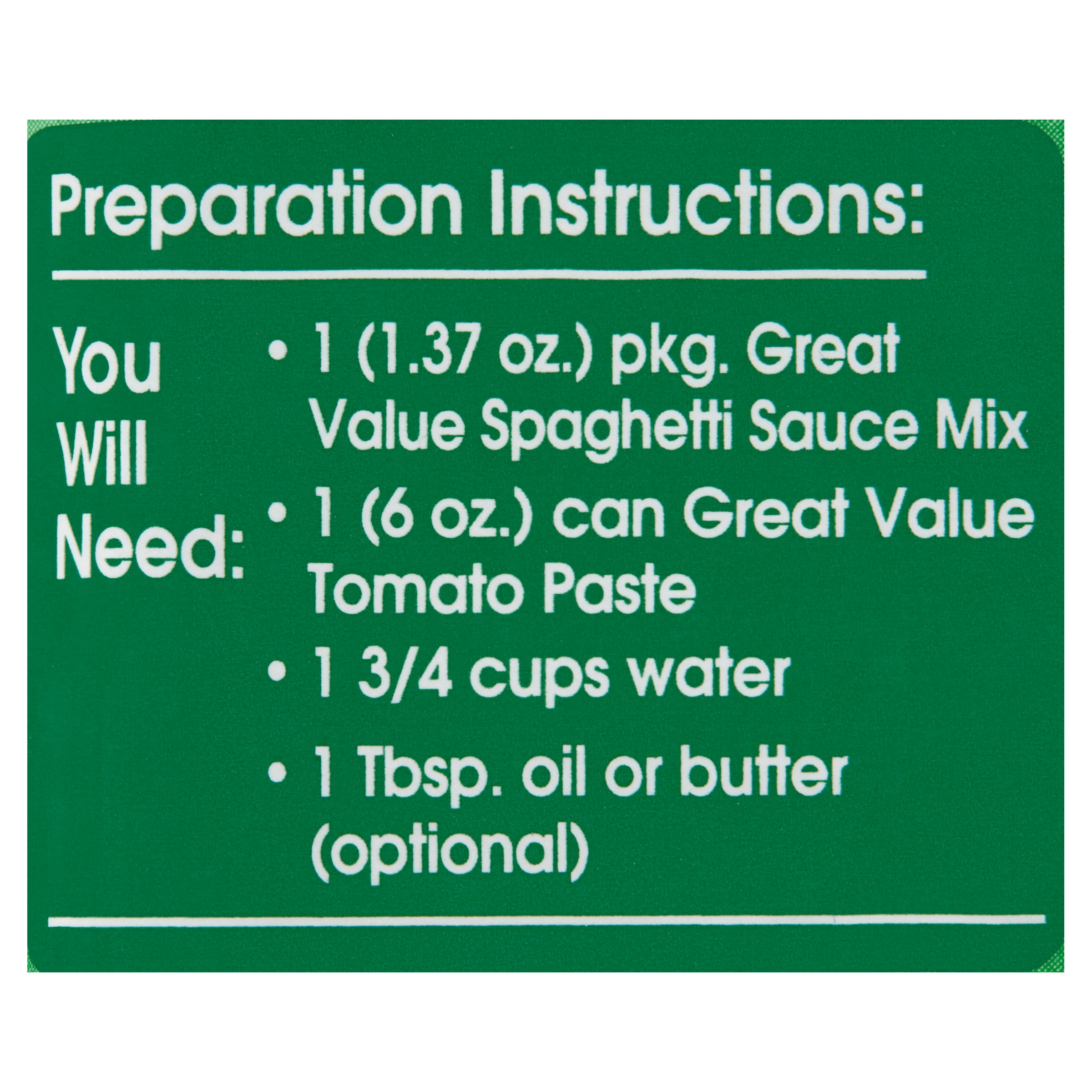 Make dinner a breeze tonight with Great Value Spaghetti Sauce Mix. This seasoning mix offers the perfect combination of spices, so you can create mouthwatering spaghetti sauce at home. All you need is one can of tomato paste, water, and oil or butter and this seasoning packet. Simply combine the ingredients in a saucepan and bring to a simmer for ten minutes, and you’ll have your own homemade sauce to wow friends and family. Serve it up over your favorite pasta and you’ll have a complete dinner for up to five people. Treat yourself to the delicious taste of Great Value Spaghetti Sauce.