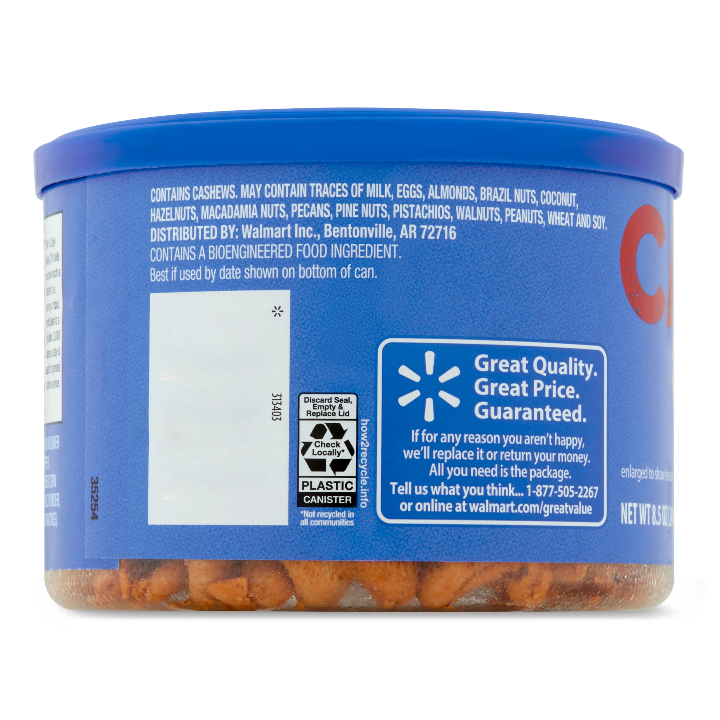 Bring a little spice to your life with Great Value Sriracha Cashews. Mild yet zingy, these nuts are coated in sriracha, a hot and tangy seasoning, which enhances the already smooth and savory flavor of a cashew. This 8.5-ounce tin is the perfect size to keep at your desk at work or in the pantry at home for when you want to enjoy a quick snack easily within reach. With five grams of protein per serving, these exceptionally tasty nuts will keep you full of energy for whatever the day throws your way. Their salty and fiery combo will get your taste buds hopping. For an extra extraordinary way to enjoy, add some to recipes such as broccoli stir-fry, kale salads, trail mix, or anything that you think could use a spicy kick. Liven up your snack time with Great Value Sriracha Cashews.
