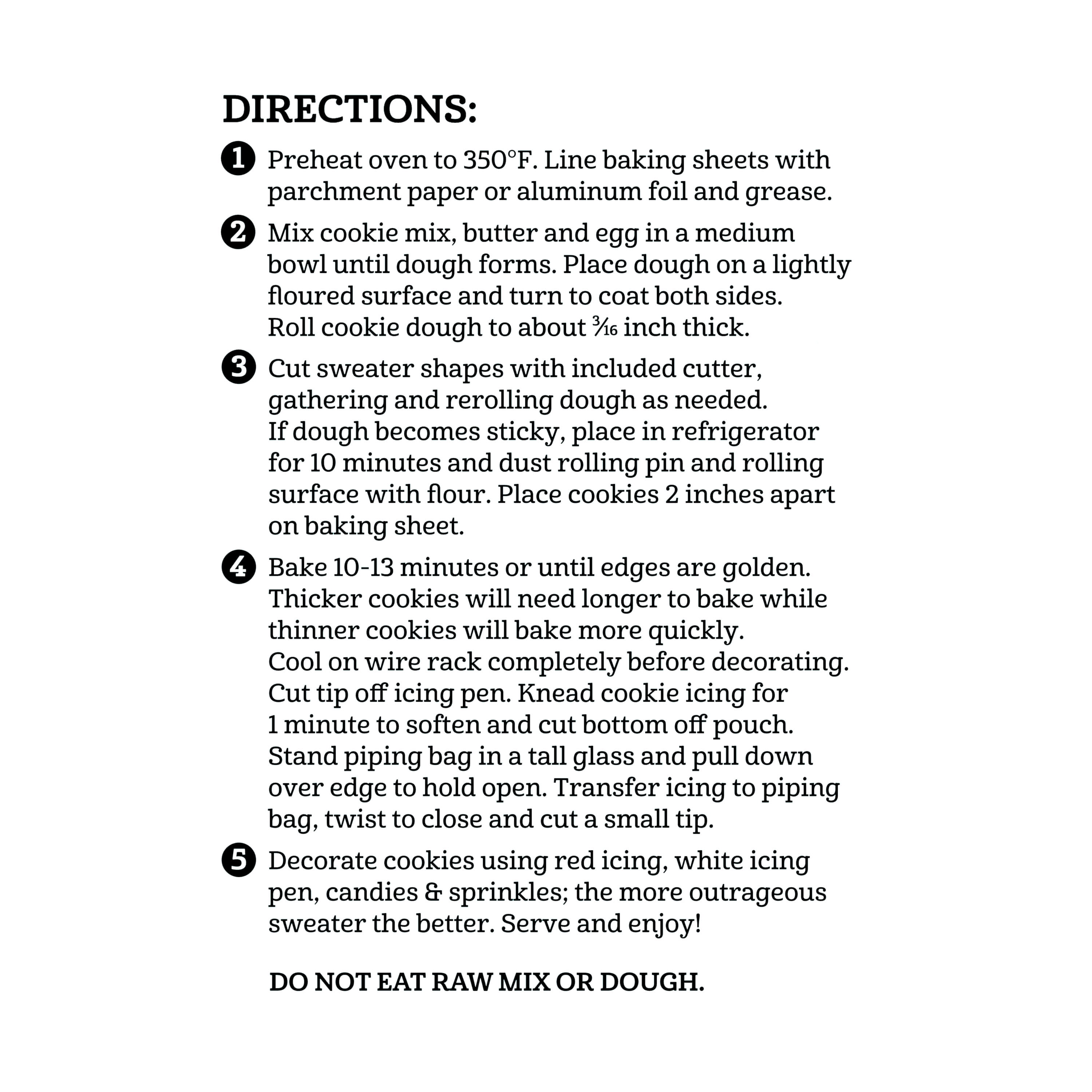 - Kit includes sugar cookie mix, a red icing pouch, snowflake sprinkle mix, candy cane candies, a white icing pen, and a sweater cookie cutter