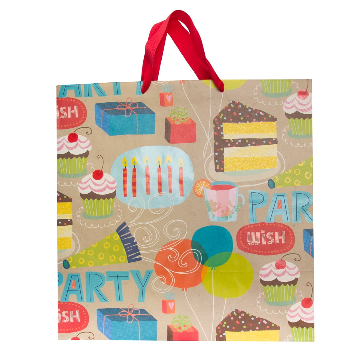 – Jumbo size, festive gift bag for birthday presents; Colorful, glittery pattern of cakes & candles
