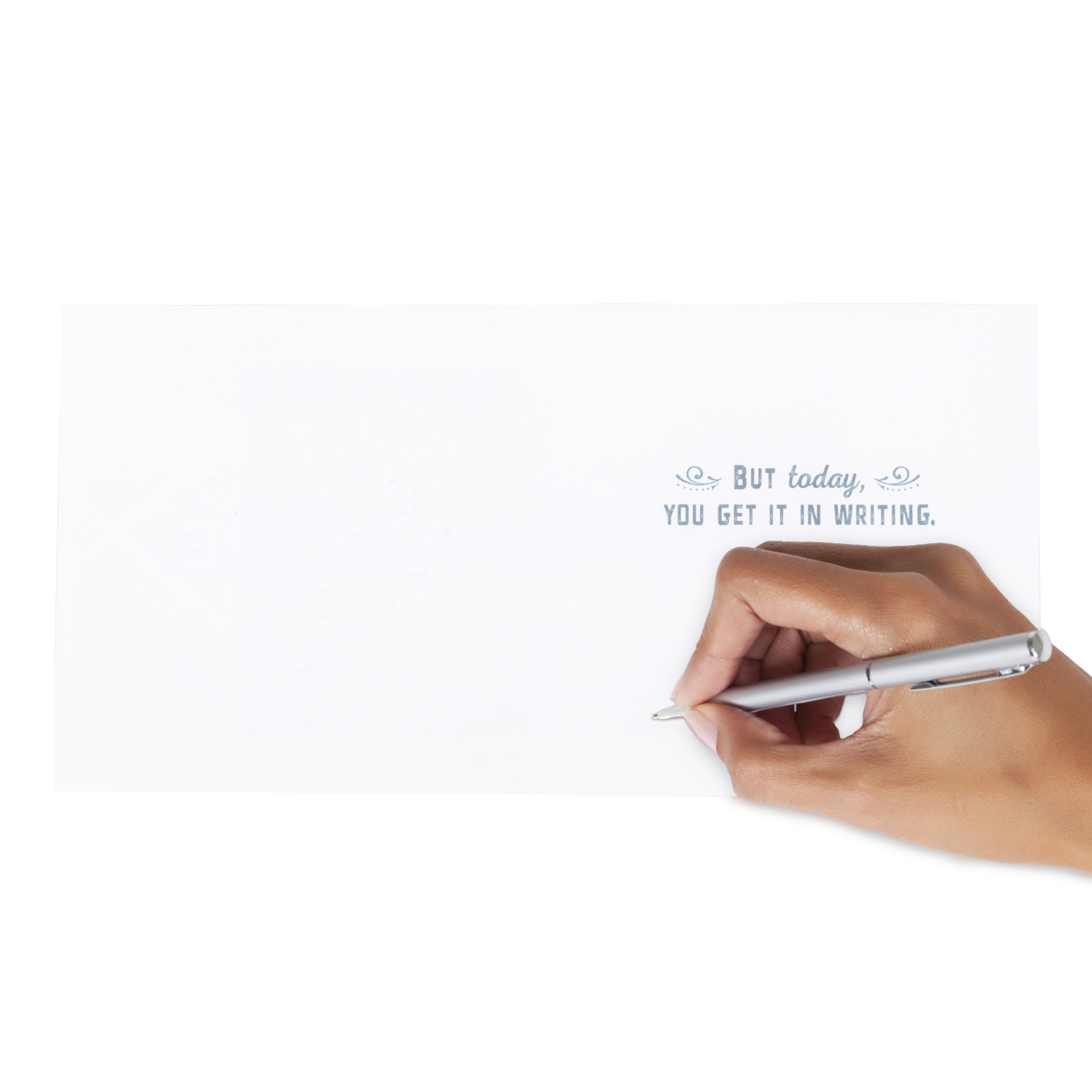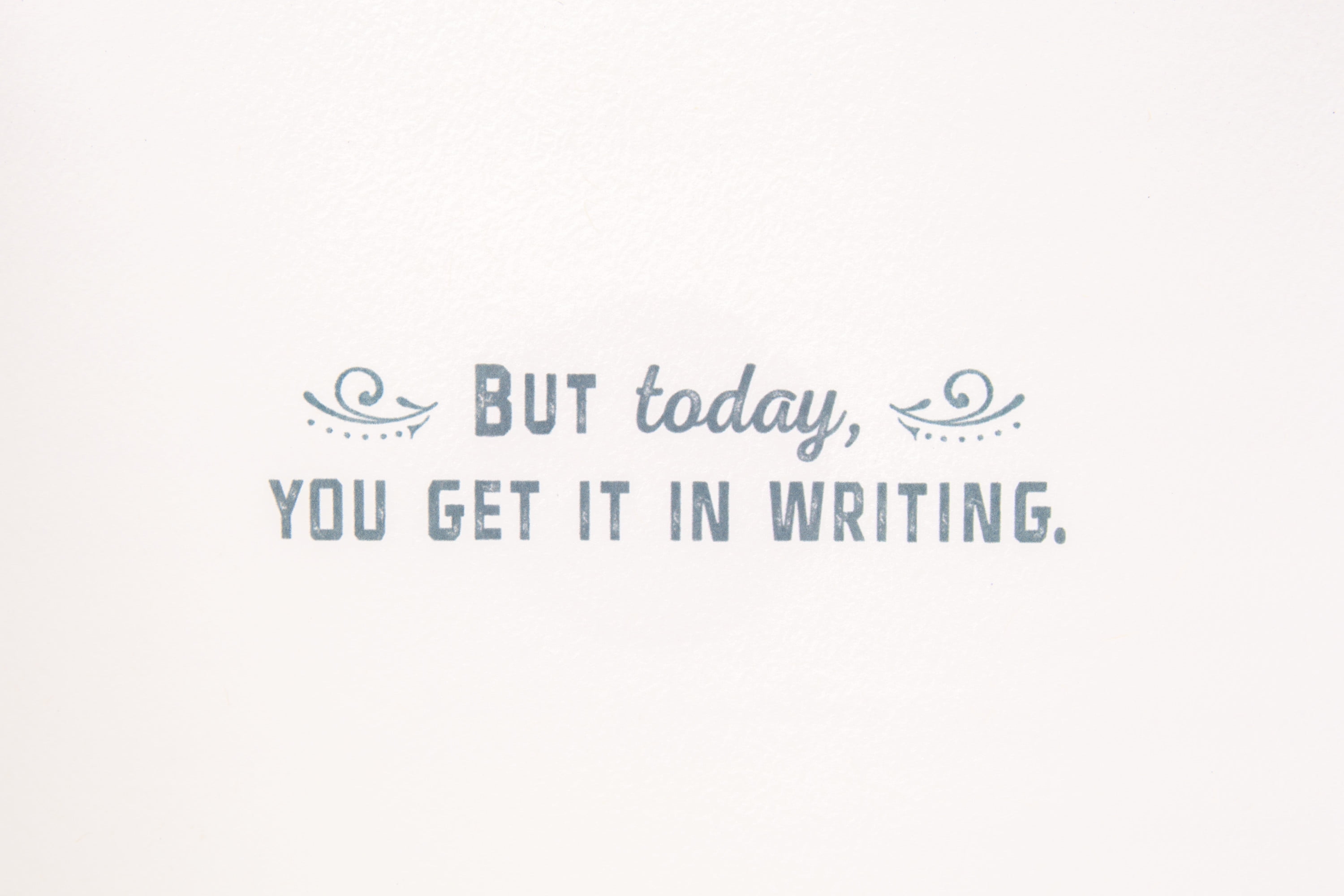 - Cover features a nature scene with stamped lettering. Inside reads: "But today, you get it in writing."