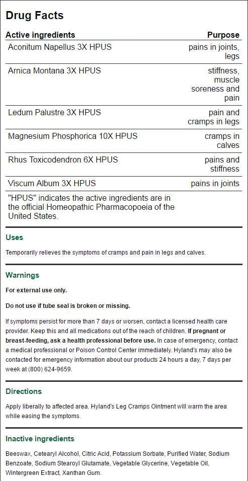 Hylands Leg Cramps Ointment Wintergreen 2.5 oz. 70.9 g Hyland’s Leg Cramps Ointment is a traditional homeopathic formula for the temporary symptomatic relief of cramps and pains in legs and calves. Leg Cramps Ointment works quickly to relieve cramps and pains in the legs and calves while warming the affected area. This ointment is 100% natural and non-greasy with a pleasant wintergreen scent. Leg Cramps Ointment is soothing and warming, and works fast.PAIN RELIEF OF LEG CRAMPS: Natural relief of cramps and pains in legs and calvesEASY TO USE: Applied ointment will soothe the calves and legs while warming the affected areas2.5 oz of Hyland’s Leg Cramps Ointment made with Arnica