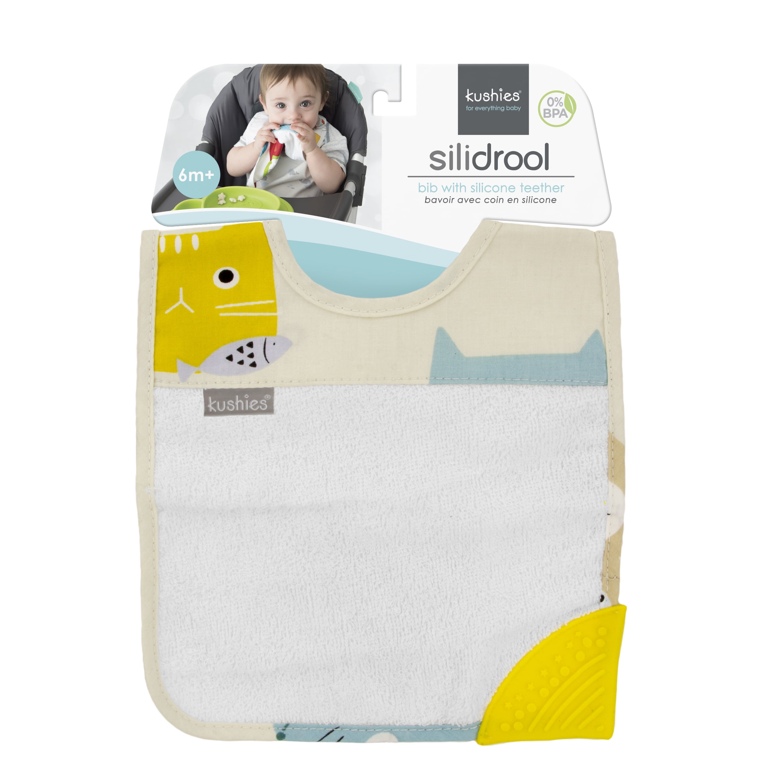 Get Sili with Kushies’ new silicone line of fun and practical feeding items! The Silidrool bib features a cotton terry side and a chic printed cotton side giving you the option to choose which side works best for you. A food grade silicone teether is attached to the corner of the bib which is safe for teething babies to chew. Ideal for drooling/teething babies and feeding alike, this reversible bib has your baby covered. A magnetic closure at the back makes it easy to put on and take off. Be sure to check out the rest of the new Kushies silicone feeding line. BPA, PVC and phthalate free.