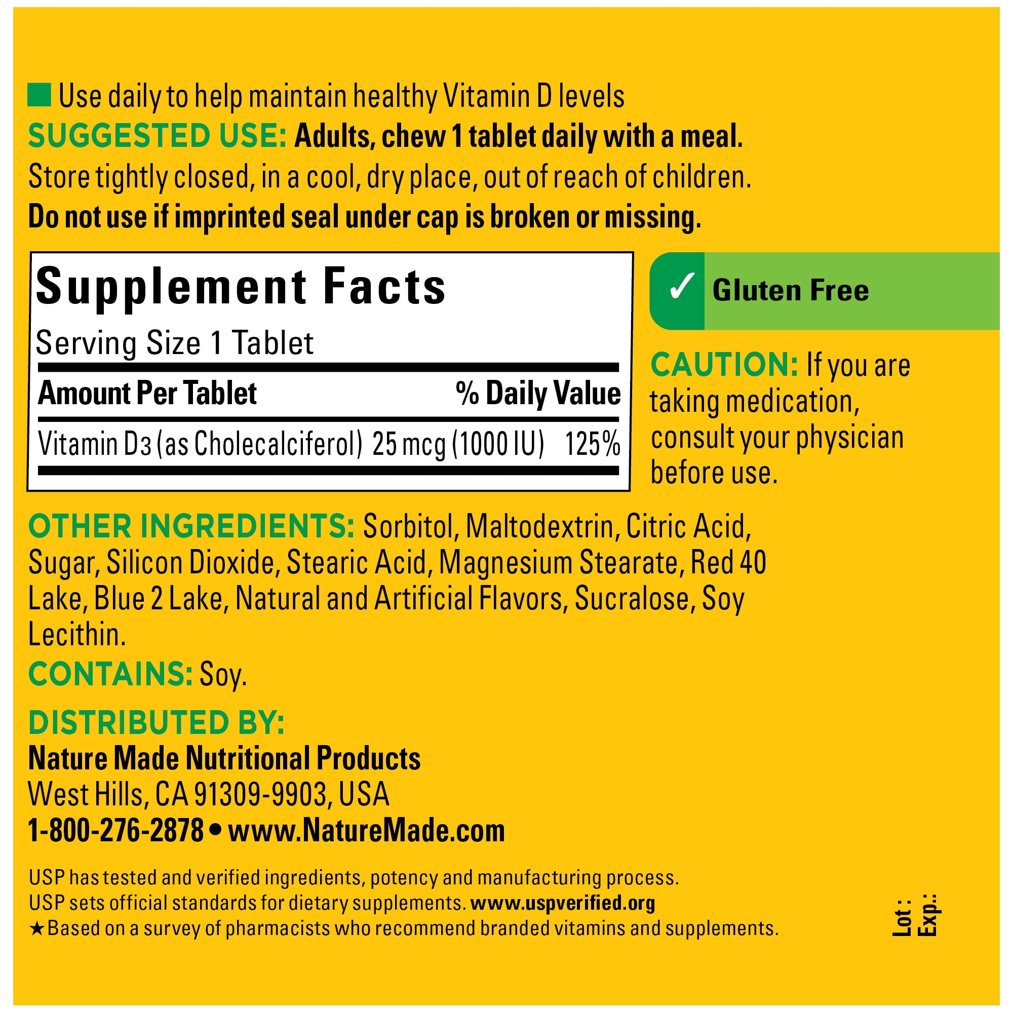 Nature Made Vitamin D3 chewable tablets are an easy and effective dietary supplement to support muscle, bone, teeth, and immune health. While sunshine is a great source of Vitamin D, many people aren’t making enough of this essential nutrient from the sun. Vitamin D is a common nutrient shortfall. In fact, 95% of the US population does not get enough Vitamin D from food alone, making supplementation that much more important.(1) Support your sunshine and Vitamin D dietary needs today, with Nature Made’s Vitamin D3 1000 IU (25 mcg) 240 Count chewable tablets. (1)NHANES 2005-2016 Nutrients 2020, 12, 1735. *Based on a survey of pharmacists who recommend branded vitamin and supplements