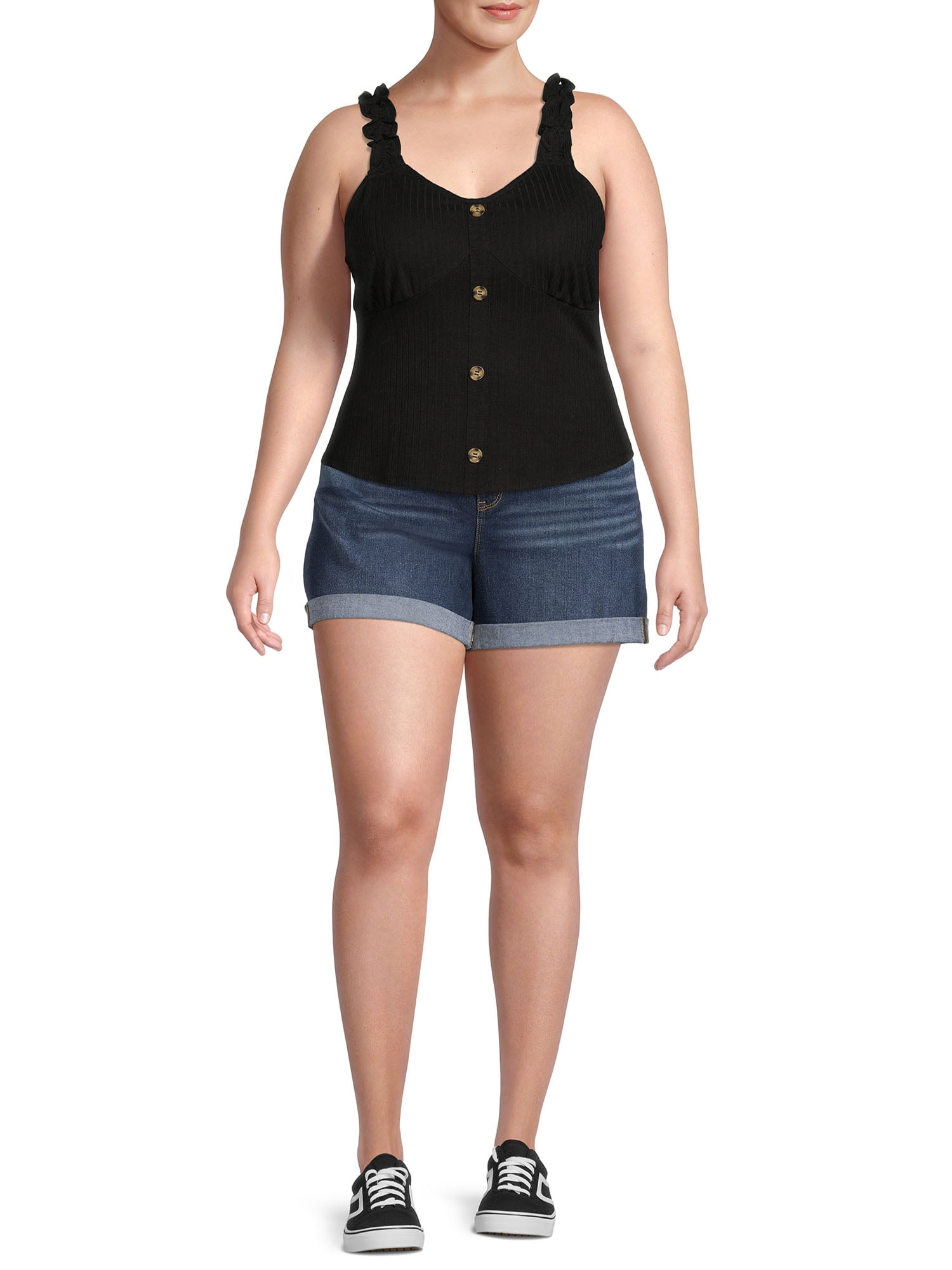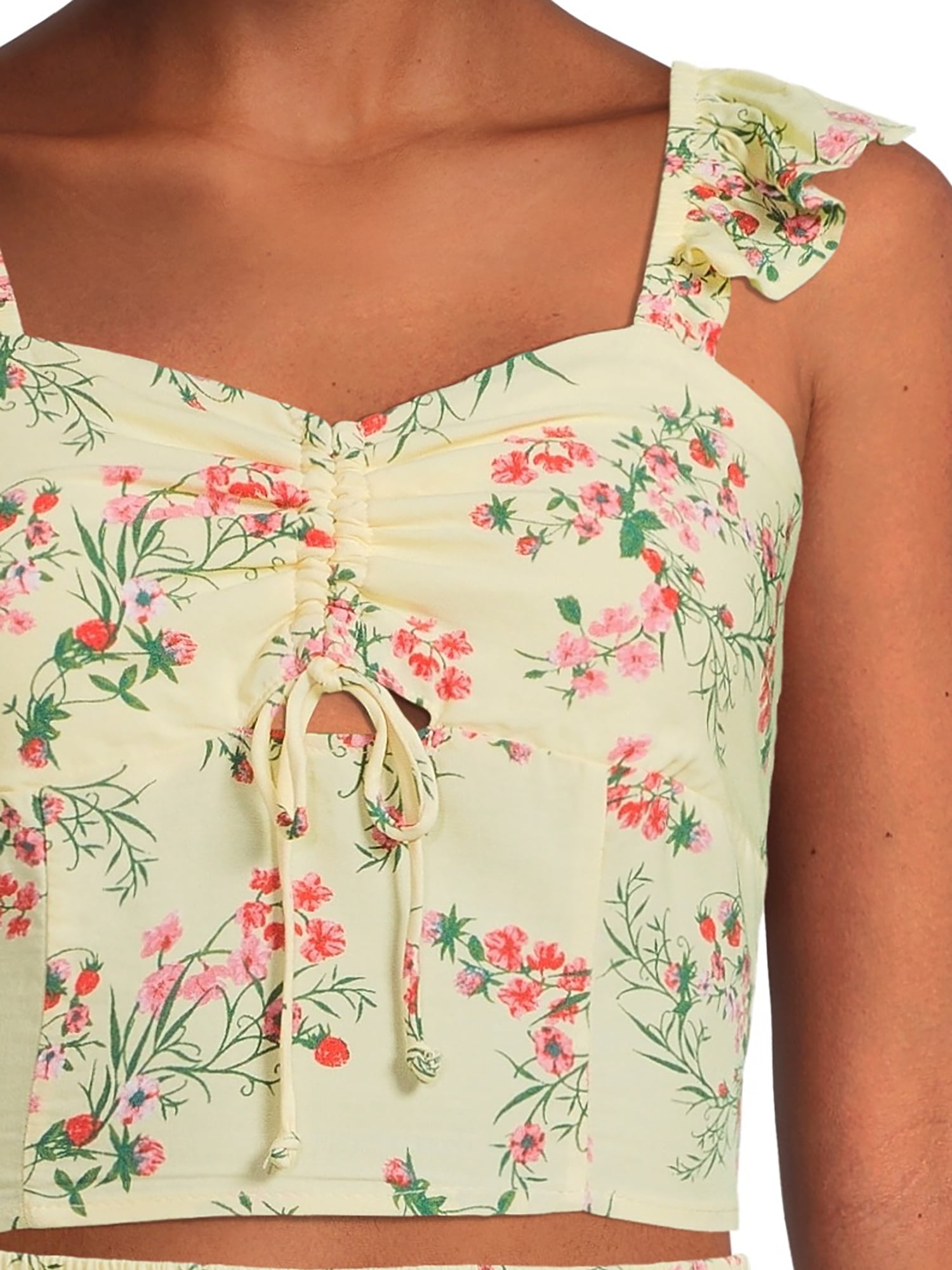 - Tank features: Sweetheart neckline; cinched front; ruffle straps; shirred back