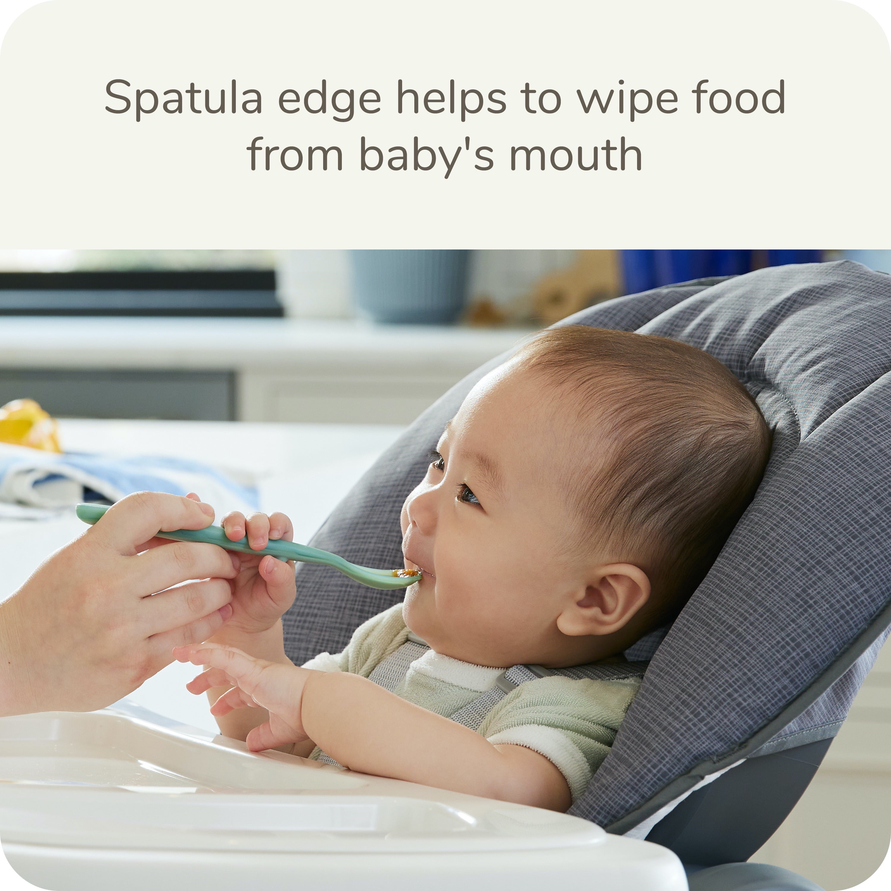 Mashed avocados. Pureed peas. Runny apple sauce. Baby’s first foods can make mealtime an adventure. Eating can be less messy with the NUK Rest Easy Baby Spoons, designed with Rest Easy support to keep germs off the baby spoon and excess food off the table. The tips of these infant spoons are soft and gentle on teeth and gums, while the spatula edge helps to easily wipe food off baby’s face. Parents love these dishwasher-safe and BPA-free spoons for baby’s first bites.