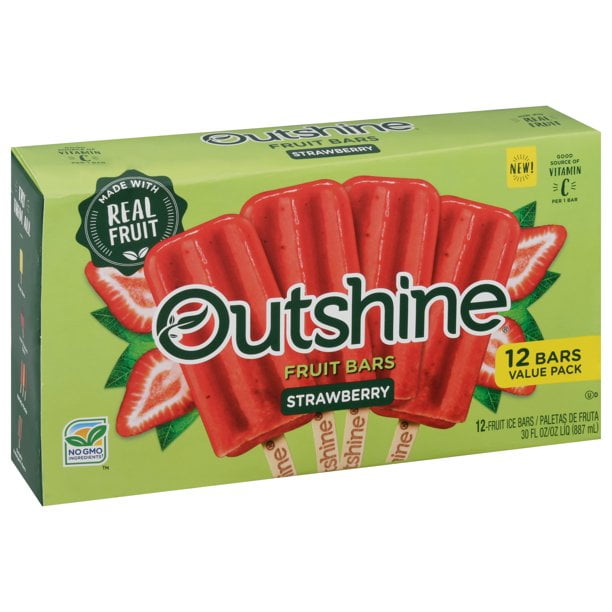 Outshine Strawberry Frozen Fruit Bars are a refreshing frozen snack bursting with delicious strawberry flavor. Made with real fruit, these 12 gluten free fruit bars are a good source of Vitamin C for a great tasting snack. This fat free frozen snack is made with no GMO ingredients and has no artificial colors, flavors or sweeteners and no high fructose corn syrup. Outshine proudly offers refreshingly delicious frozen fruit bars for a snack that helps you shine brighter.
