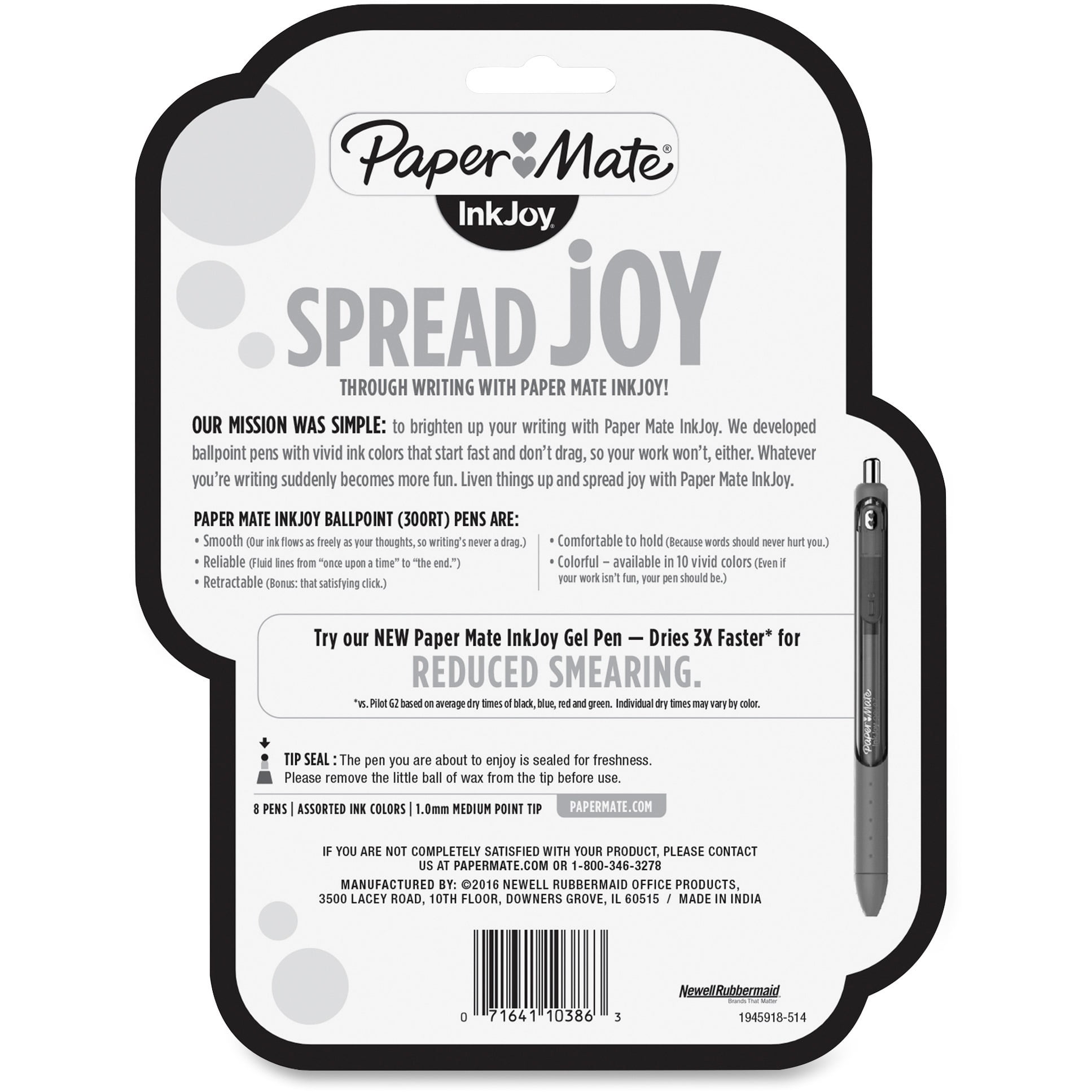 Retractable ballpoint pens feature Paper Mate’s revolutionary InkJoy writing system for effortless writing. The InkJoy writing system with ultra-smooth, vivid ink starts quickly without dragging, requires minimal pressure from your hand, and delivers crisp, clean lines every time. Extended rubberized grip provides optimal comfort. Metal clip provides long-lasting durability and can be used to attach pen to pockets, notebooks and more. Transparent color-tinted body of the InkJoy 300 RT offers a refreshing look.