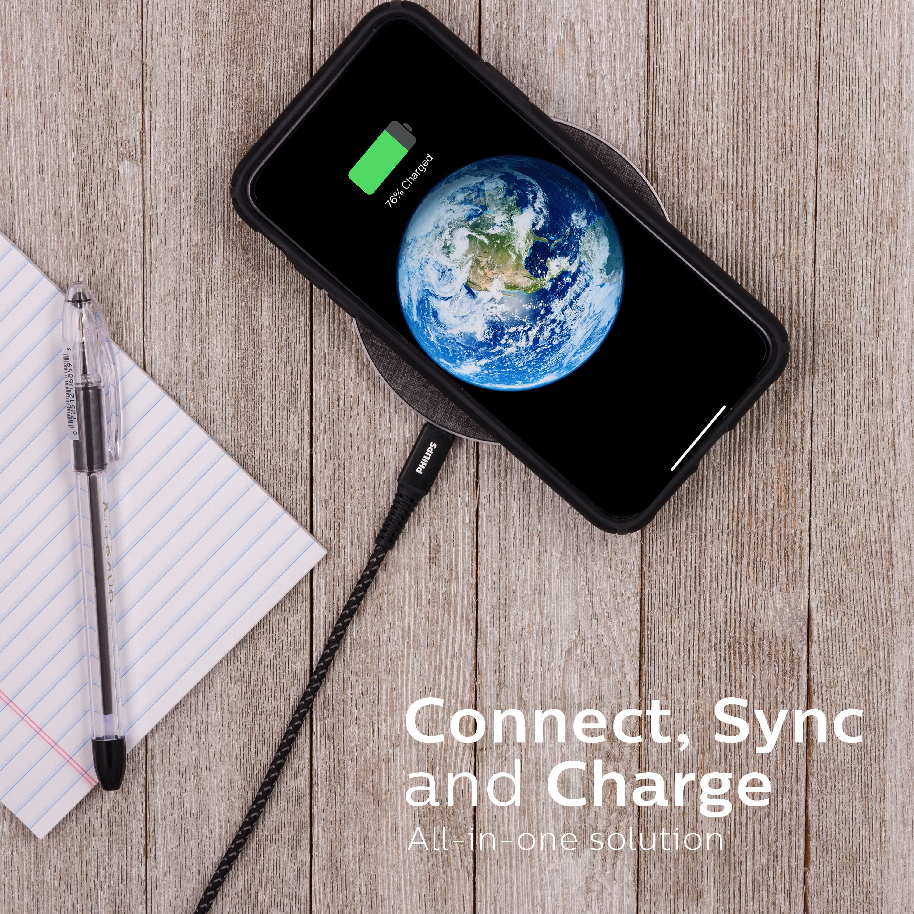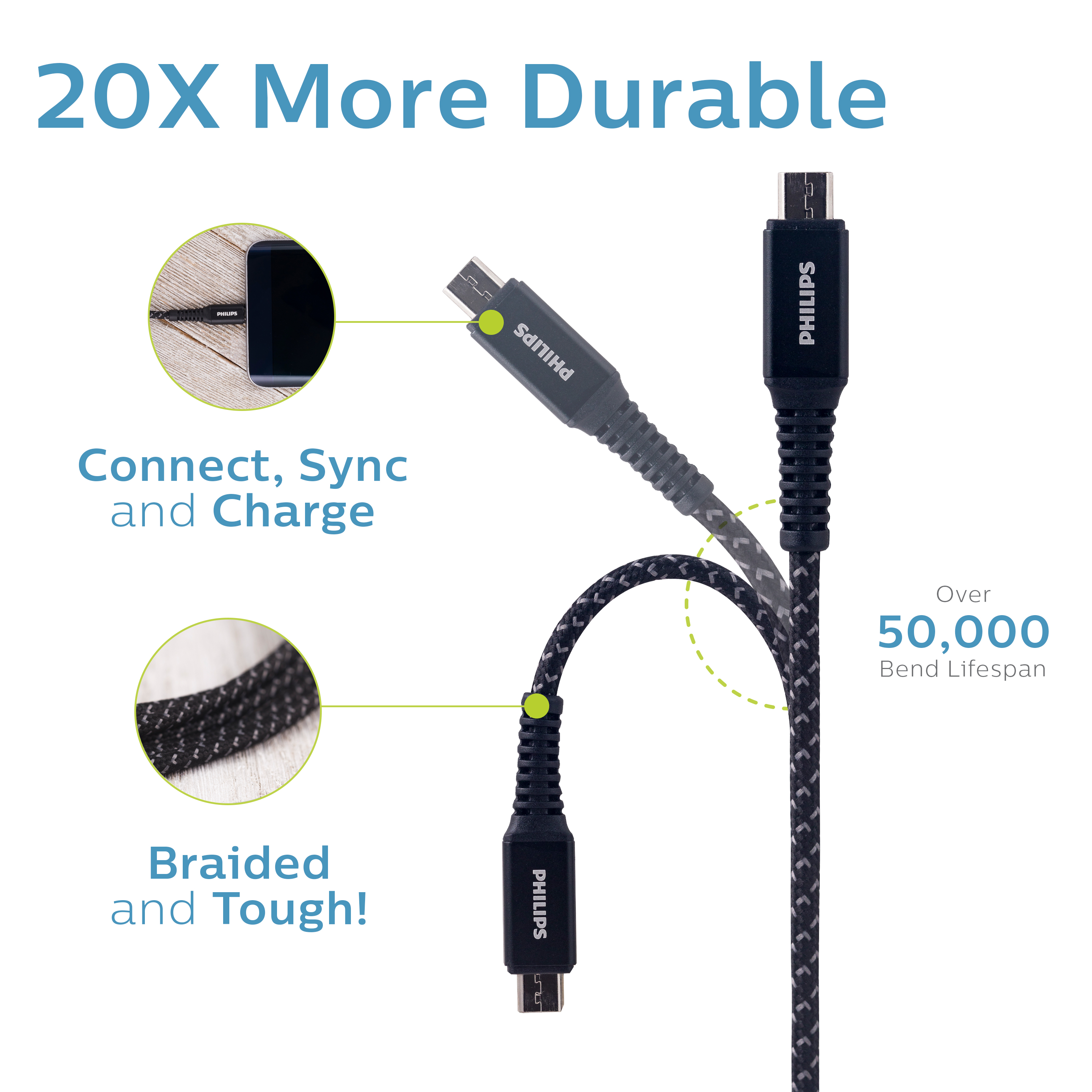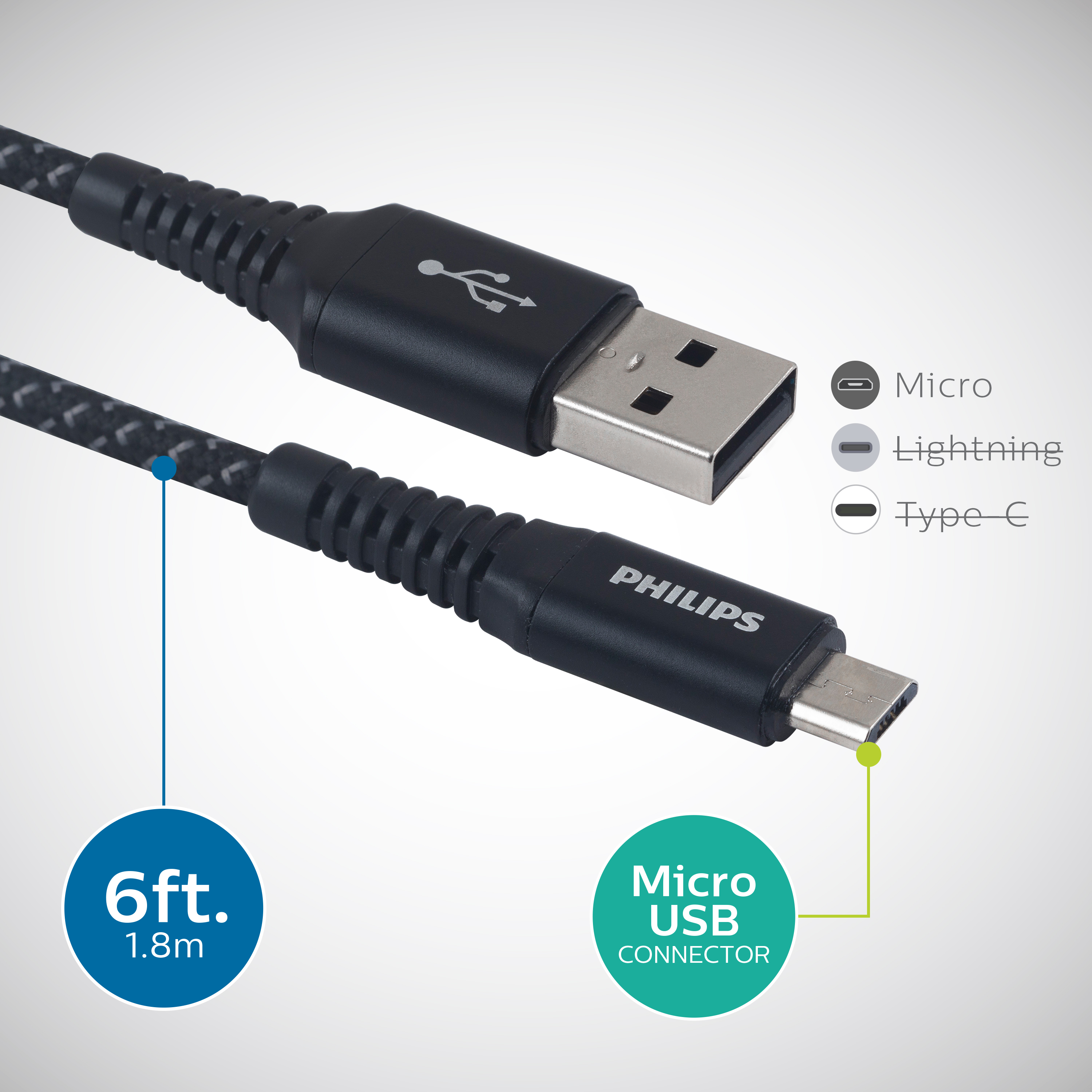 Philips Braided Standard USB to Micro USB Charging Cable – Durable, 6 ft