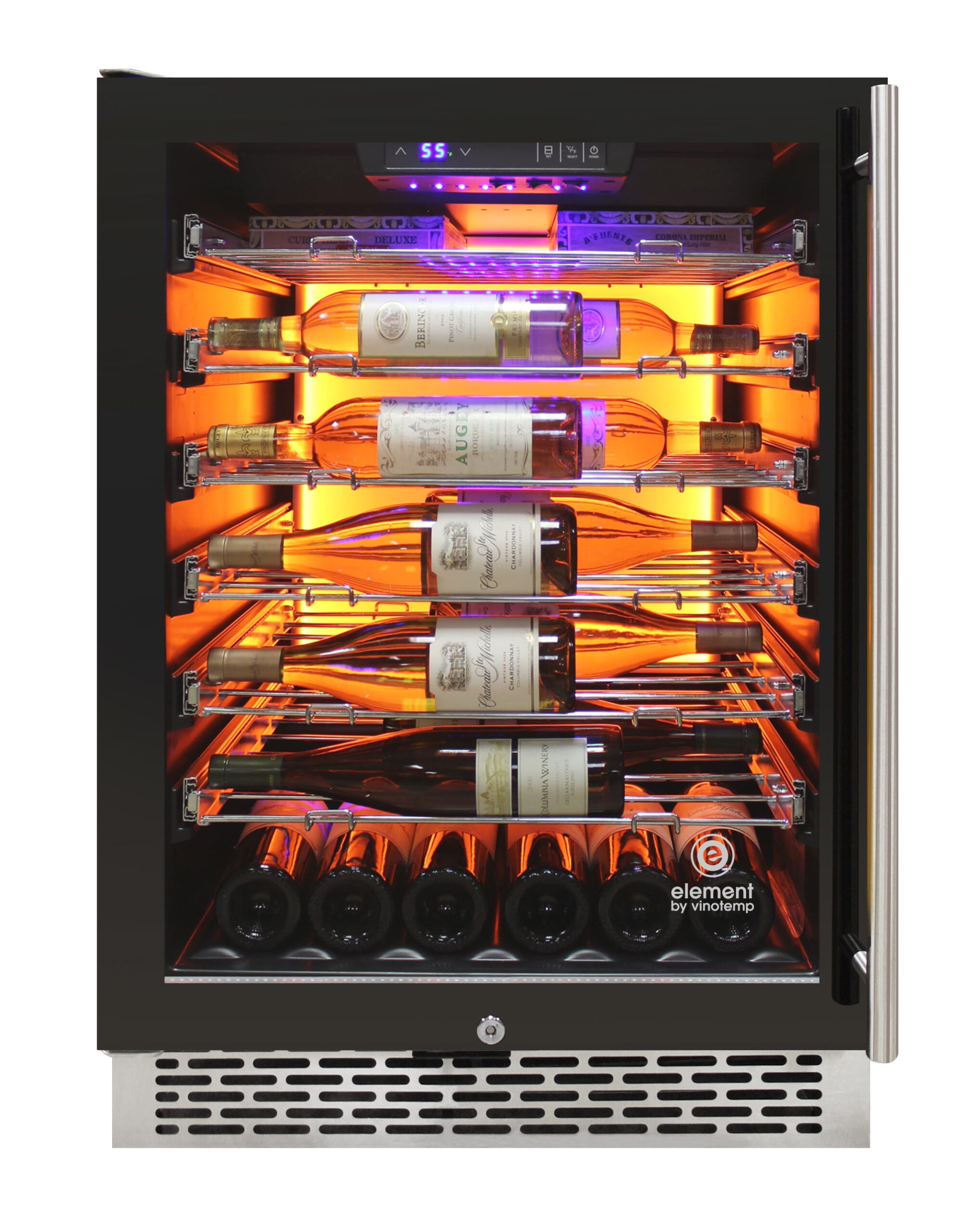 Vinotemp’s Private Reserve Series 117 Can Backlit Panel Commercial Beverage Cooler has innovative features such as glass shelves, interior Backlit™ in three different colors, and easy to use temperature settings. This beverage cooler is front venting with easy installation to build in and fit perfectly in any kitchen or bar area. The design forward beverage cooler features vibration-damping design to better protect its contents and is engineered for low energy consumption and low noise. Its patented interior Backlit™ panel has three different options – Heliotrope, Amber, and Vinotemp BioBlu™ (which helps reduce the growth of bacteria and mold) – and can be selected at any given time. Adjustable temperature range allows users to select a proper, customized storage and serving temperature for any beverages. Sturdy, flat glass shelves display beverage cans while the racks glide and extend forward, adding to the cooler’s visual appeal and functionality. A LED temperature display makes temperatures easy-to-read and ensures beverages are being stored and served at the appropriate temperatures.