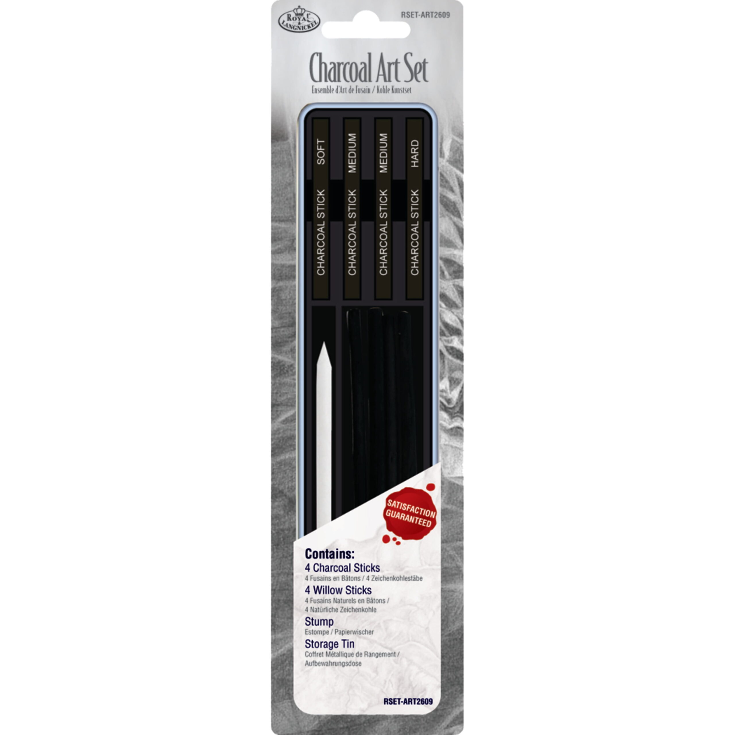 This set includes four charcoal sticks, four willow sticks and a blending stump.Royal Brush Charcoal Art Mini Tin Set