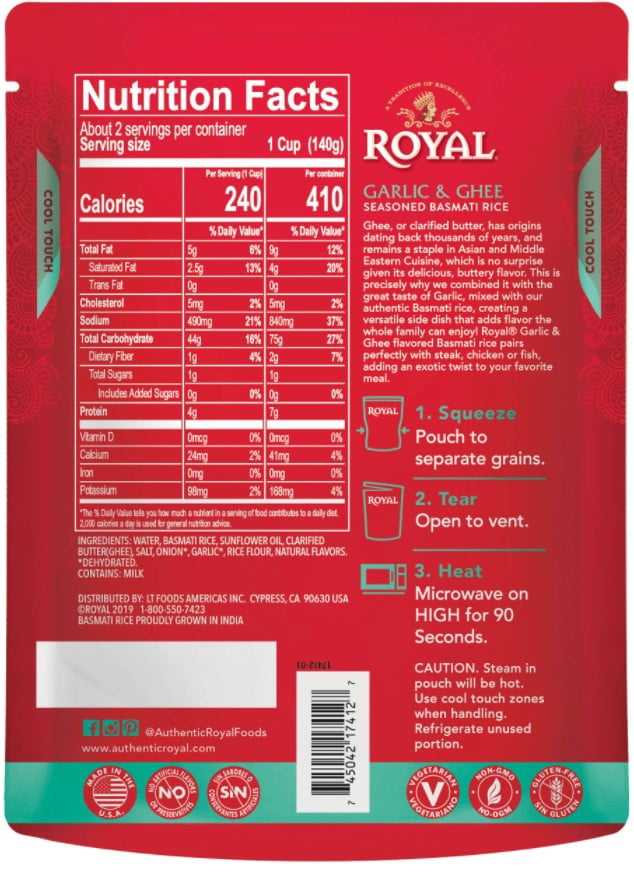Royal Garlic & Ghee 8.5oz Ready to Heat Rice, is a versatile ingredient for all your needs. Brought to you by Royal, ‘s #1 best-selling Basmati rice, our ready to heat rice brings you authentic flavors from around the world combined with the sweet aroma & Long grain goodness of Basmati rice. Royal’s Garlic and Ghee (clarified butter) rice is a flavorful, aromatic seasoning blend combined with our authentic Basmati rice, creates a versatile side dish that adds plenty of flavor. Our ready to heat rice is easy to cook, it takes just 90 seconds from your kitchen to the table. All of our rice is vegan, Non-GMO, Gluten free, Kosher, Halal, and non-fat. At Royal, we are committed to bringing you the highest quality authentic Basmati rice and other grains from all around the world – without compromise or exception.