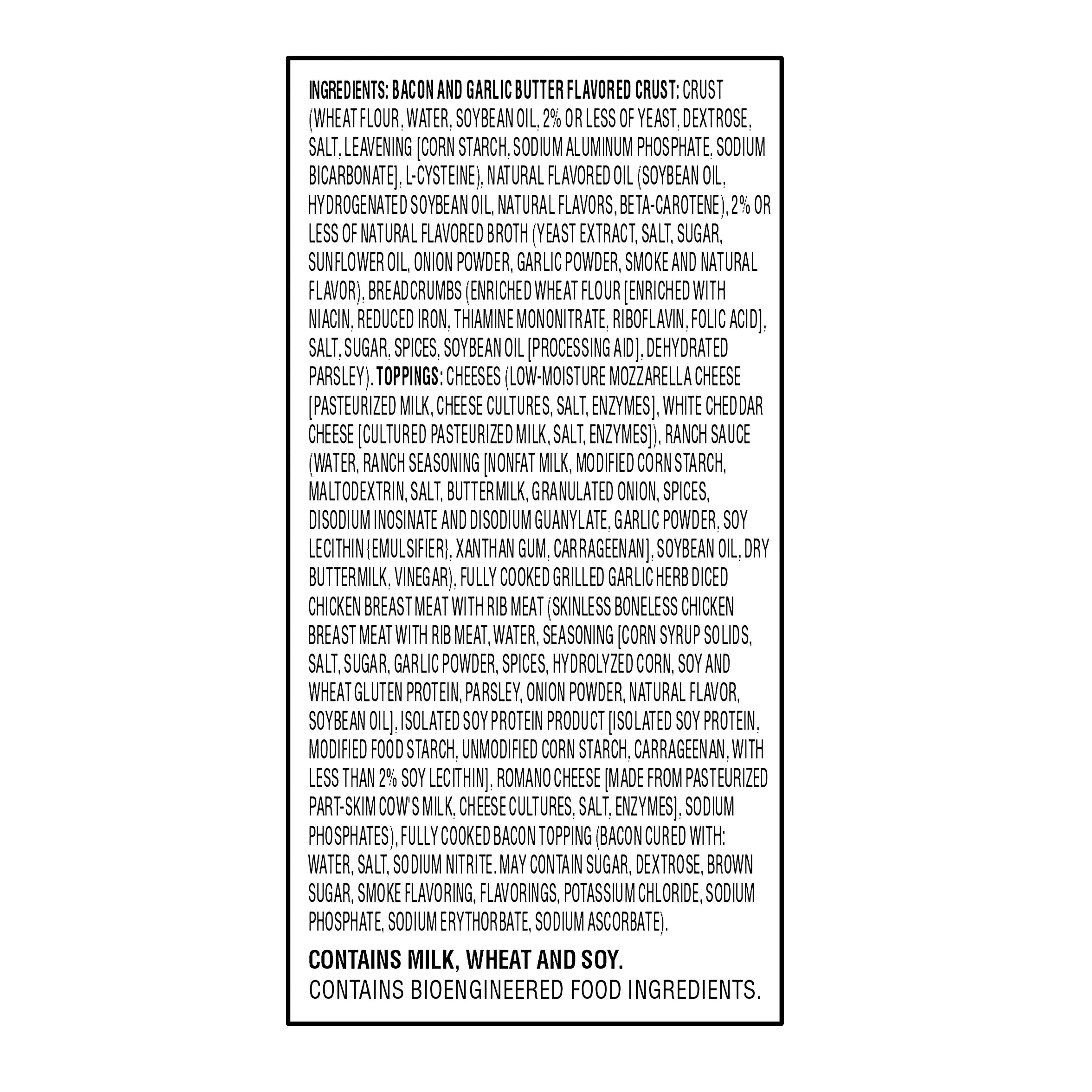 - Seasoned white meat chicken, bacon topping, ranch sauce, mozzarella and white Cheddar cheeses