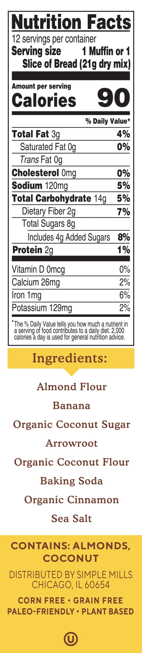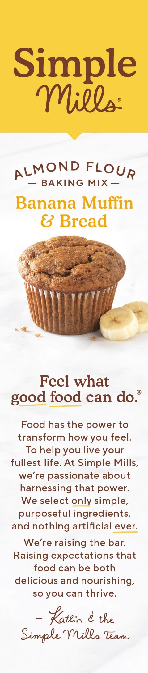 Real banana flavor from real bananas. 12 muffins or 1 loaf per box. Simple doesn’t mean you sacrifice taste; our baking mixes are "free from" but full of deliciousness. Certified Gluten free, Non-GMO, Grain Free, Corn Free, Dairy Free, Plant Based, Paleo friendly. No added sugar. No gums or emulsifiers. Only whole food ingredients. Nothing artificial, ever. Feel what good food can do. Food has the power to transform how you feel. To help you live your fullest life. At Simple Mills, we’re passionate about harnessing that power. We select only simple, whole food ingredients, and nothing artificial ever. We’re raising the bar. Raising expectations that food can be both delicious and nourishing, so you can thrive. Take a look at our baking mix ingredients compared to other brands. Our wholesome flour blend is powered by nuts & seeds. Say hello! info(at)simplemills.com. Be your brightest. Get wellness tips and recipes (at) simplemills.com You’ll also love our other baking mixes, crackers, cookies, and bars. Be friendly to the planet, please recycle.