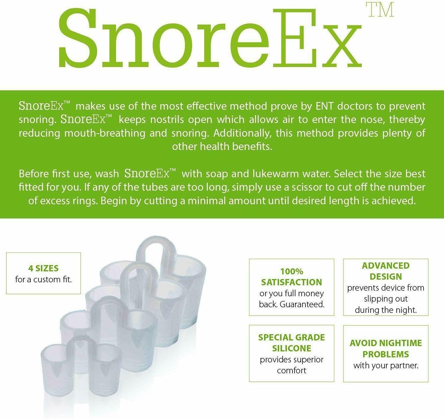 INSTANT SNORE RELIEF – The SnoreEx Anti Snoring Nose Vents instantly stop snoring by maximizing the airflow in the nasal passageways. Pack includes a set of 4 sizes; use the nose vent that works best for you.STOPS SNORING NATURALLY – The SnoreEx Anti Snore Sleep Aid Device is non-invasive and have absolutely no side effects. They are designed to be invisible, with only a thin silicone strip exposed while being used. / Upgraded and enhanced to be more comfortable.COMFORTABLE & SAFE Lightweight and Comfortable Snoring Solution. Made with soft medical grade silicone. Odor free and PBA free.SIMPLE TO USE – Simply insert the snore stopper vent into the nostrils and sleep in silence. Effective to stop snoring originating from the nose, the SnoreEx Anti-Snore Nose Vents are designed to eliminate snoring fast and simple.HYGIENE CASE INCLUDED – Comes packaged in a reusable plastic case to keep the nose vents clean and free of dust. Also perfect to use as a travel case.