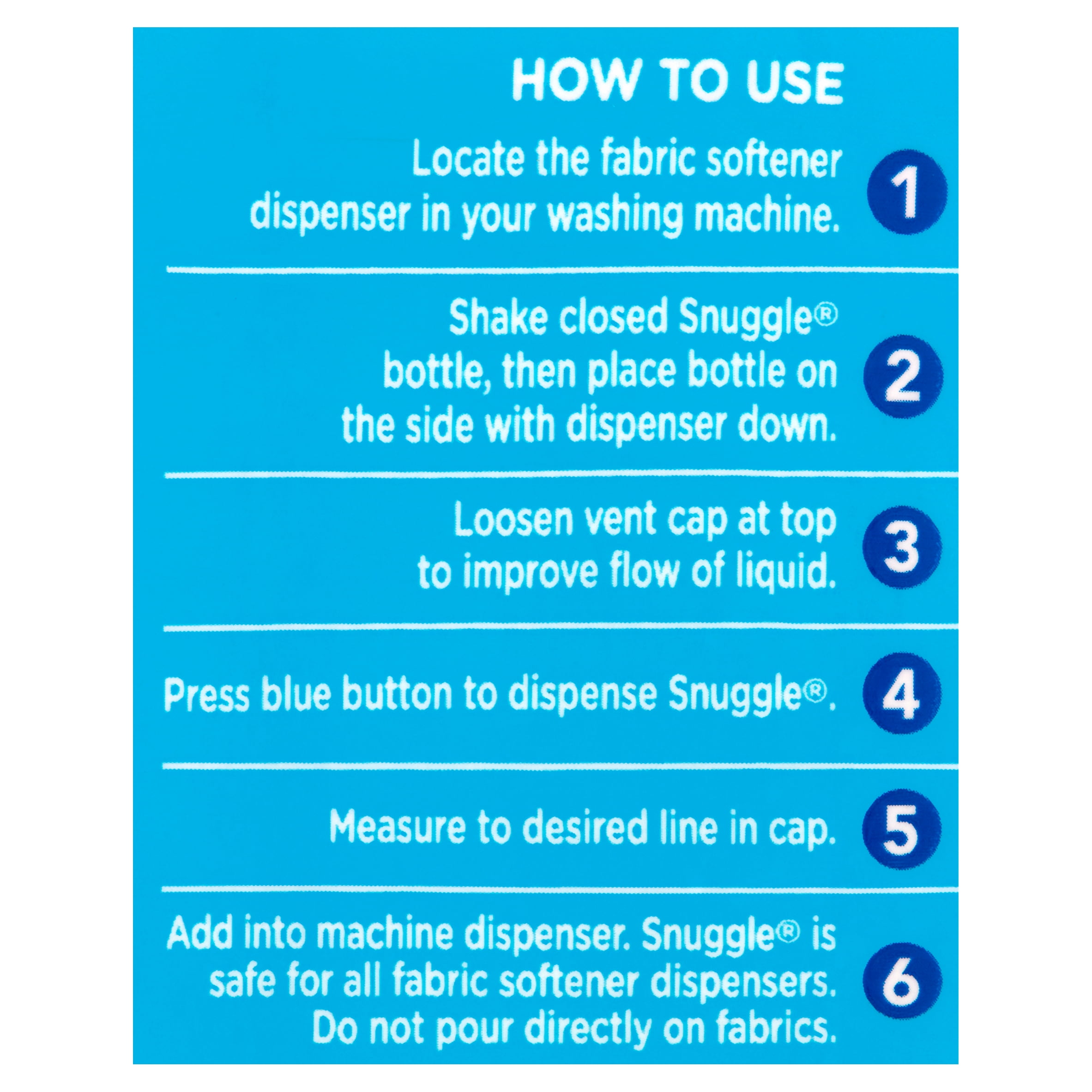 - For a top loader washing machine, add Snuggle brand liquid fabric softener during the final rinse cycle or use an automatic dispenser for added convenience. To avoid spotting, do not pour Snuggle directly onto clothes. For a front loader machine, add Snuggle brand liquid fabric softener to the built-in fabric softener tray that is often placed to the right or left of the detergent tray.